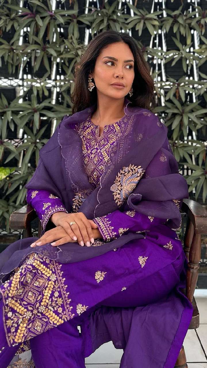 पर्पल कलर के वर्क वाले सूट में ईशा एकदम अप्सरा लग रही हैं। ऐसे सूट आपको मार्केट में आसानी से मिल जाएंगे।