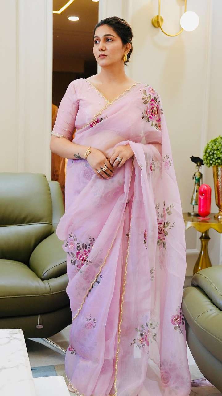 इस समर सीजन आप भी सपना चौधरी जैसी फ्लोरल प्रिंट कॉटन साड़ी पहनकर पटोला दिख सकती हैं। इसके साथ वन फोर्थ ब्लाउज मैच किया जा सकता है।