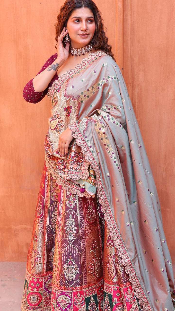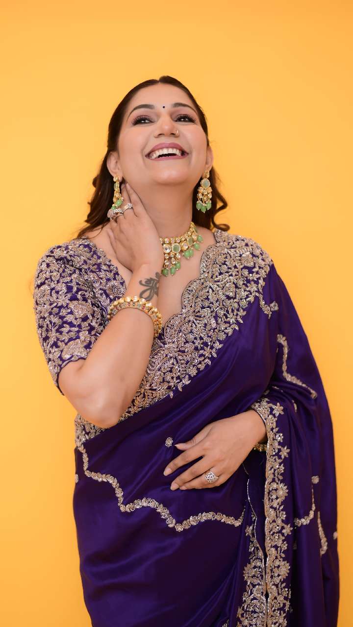 सपना पर्पल कलर की गोल्डन ब्रॉड एम्ब्रॉडयरी सिल्क साड़ी हैवी वर्क ब्लाउज में कहर ढहा रही हैं। इसके साथ कंट्रास्ट ग्रीन बीड्स ज्वैलरी काफी जंच रही है।