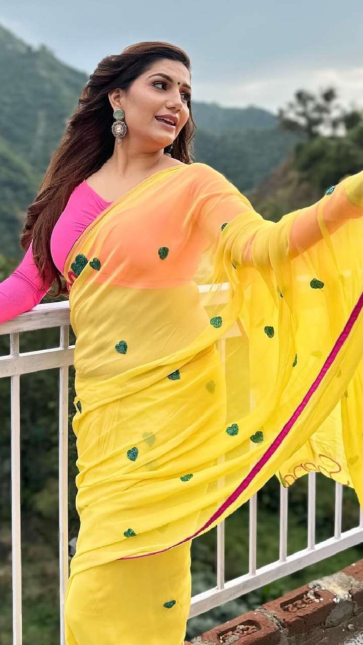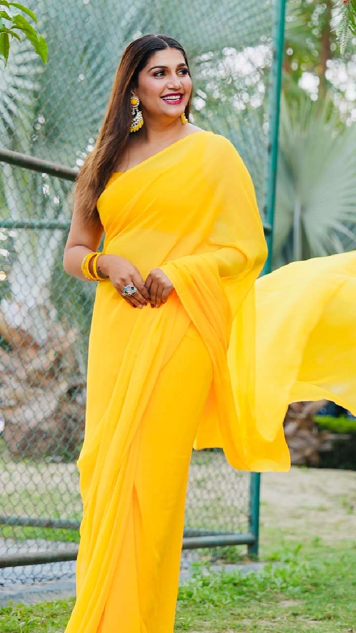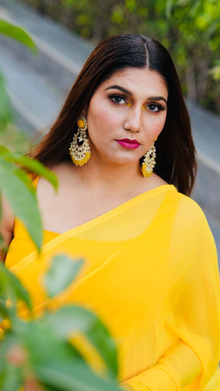 सपना ने येलो कलर की प्लेन साड़ी कट स्लीव्स ब्लाउज में अपना लेटेस्ट लुक शेयर किया है। जिसके साथ उन्होंने मैचिंग झुमके भी कैरी किए हैं।