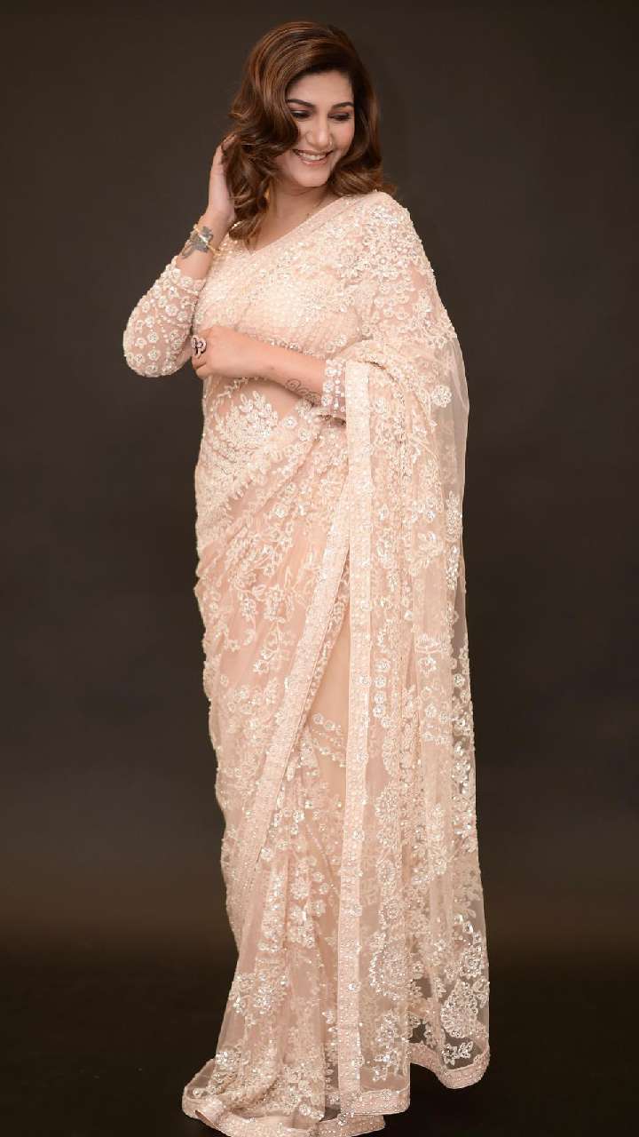 समर फंक्शन के लिए इस तरह की व्हाइट नेटिड साड़ी फुल स्लीव्स ब्लाउज लुक काफी स्टाइलिश लुक दे रहा है। इसके साथ कर्ली हेयर मिनिमल मेकअप खूब जचेगा।
