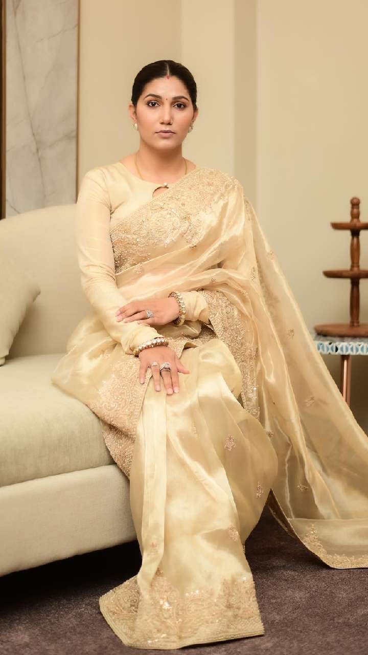 गर्मियों में आप भी लाइट कलर की कॉटन सिल्क साड़ी पहन खुद को रॉयल लुक दे सकती हैं। सपना ने इसके साथ फुल स्लीव्स ब्लाउज पेयर किया है।