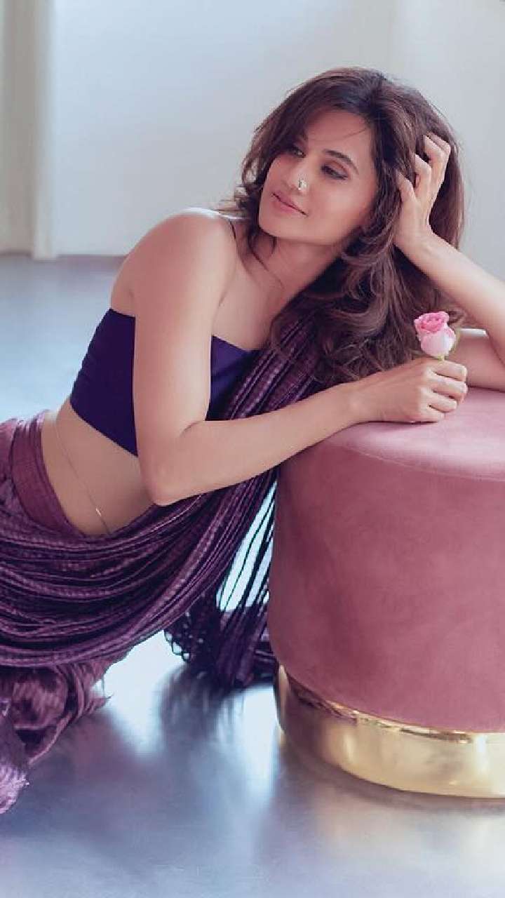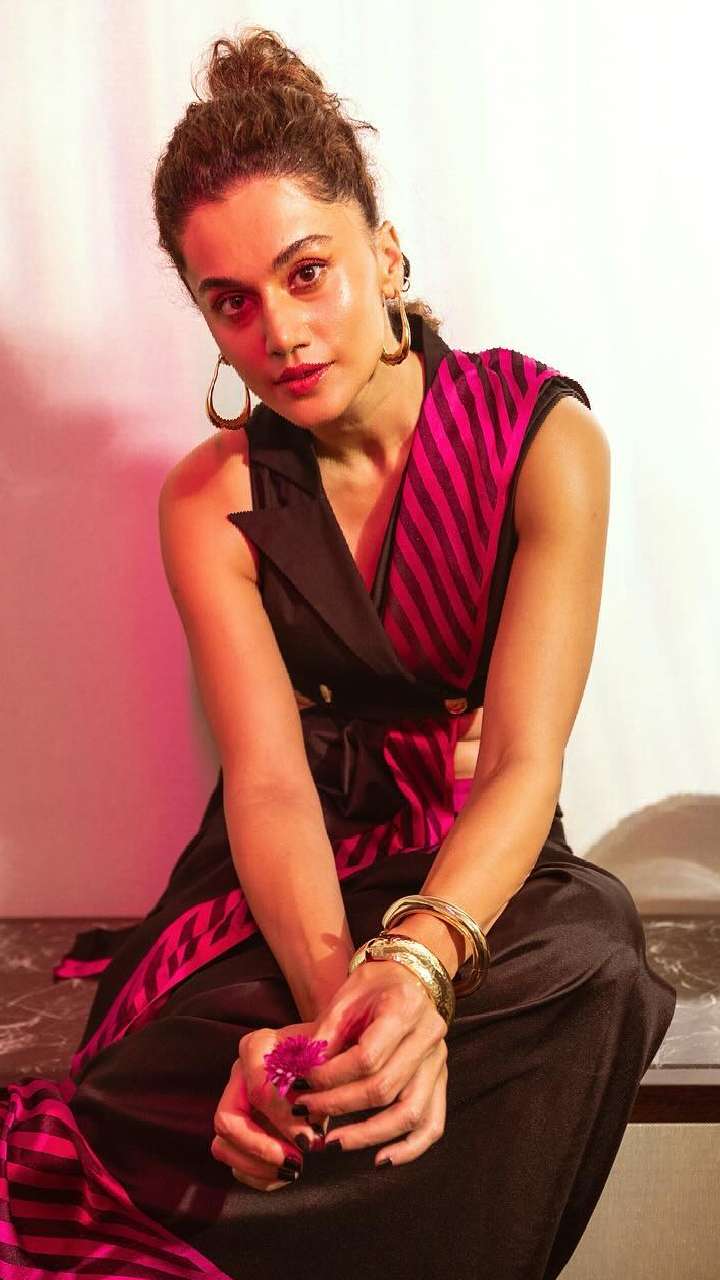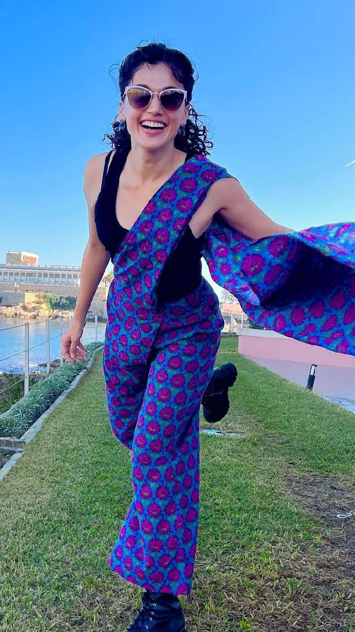 इस पर्पल कलर की टिशू साड़ी ऑफ शोल्डर ब्लैक ब्लाउज में आप तापसी की किलर अदाएं देख सकते हैं।