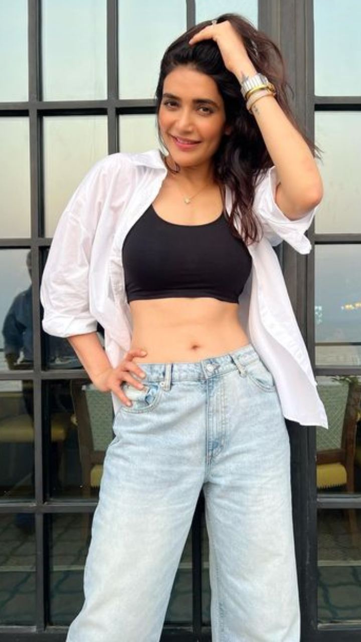 करिश्मा तन्ना शार्ट डेनीम जींस में पोज देती हुई बेहद बोल्ड लग रही हैं।