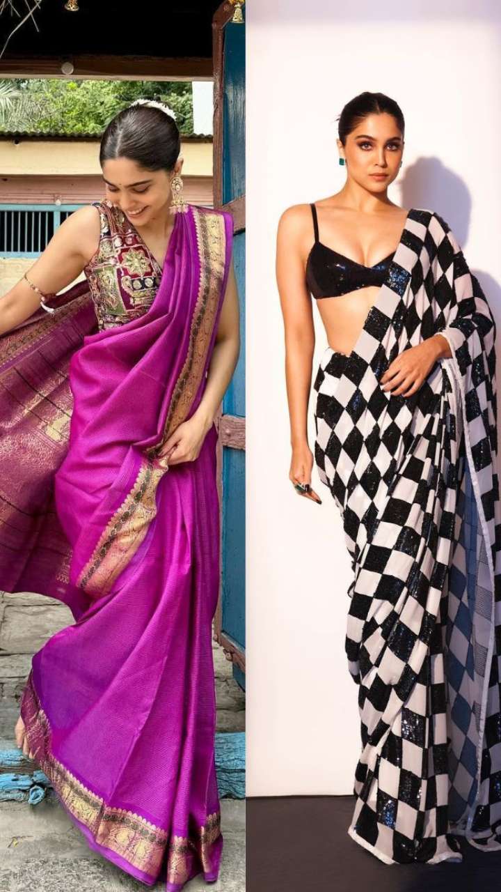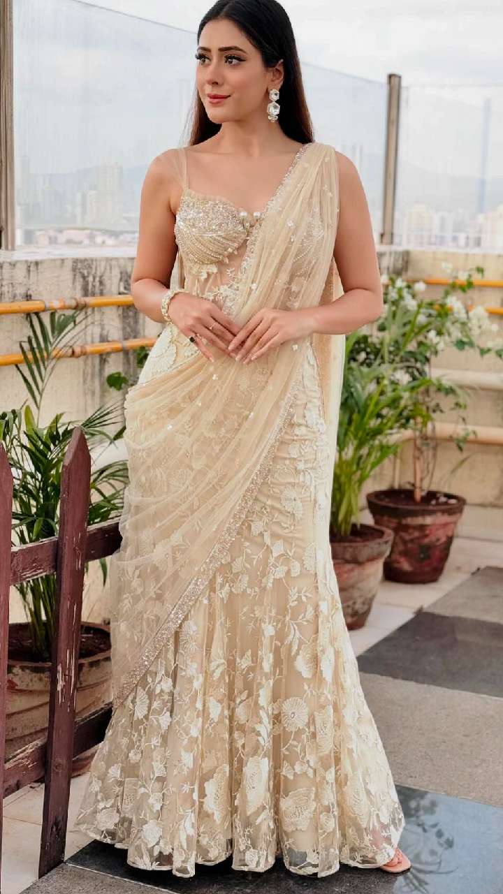 आप हिबा नवाब की तरह वी नेक फुल स्लीव्स ब्लाउज को भी स्टाइल कर सकती हैं और लुक को मॉडर्न लुक दे सकती हैं।