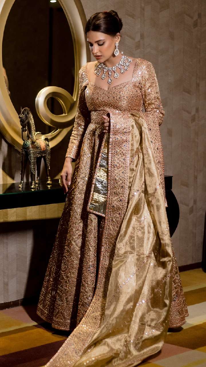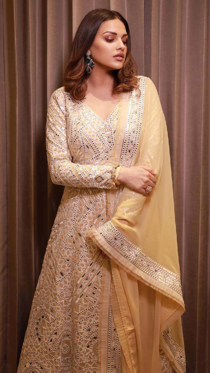 हिमांशी गोल्डन कलर की हैवी वर्क अनारकली सूट में बहुत प्यारी लग रही हैं। उनका ये लुक ट्राई करके आप भी महफिल की जान बन जाएंगी।