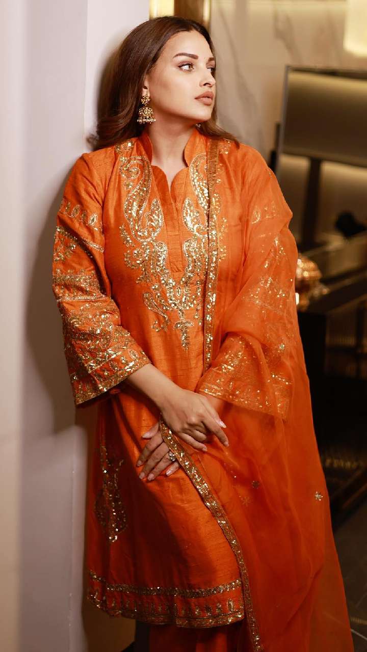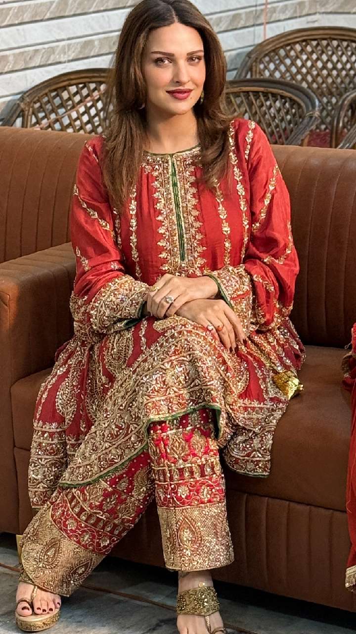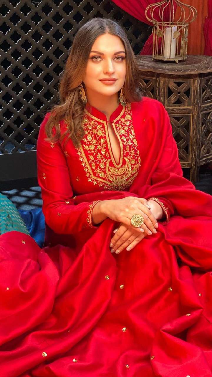 हिमांशी ने रेड कलर की जरी वर्क सूट कैरी किया है, जो उनके लुक पर चार चांद लगा रहा है। ऐसे सूट्स शादी-फंक्शन के लिए बेस्ट ऑप्शन है।