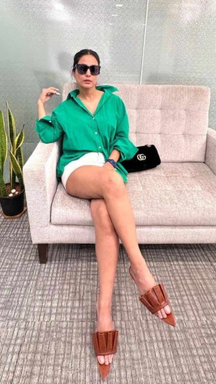 हिना ने तस्वीर में ग्रीन कलर का शर्ट और व्हाइट कलर की शार्ट्स पहनी हुई हैं।