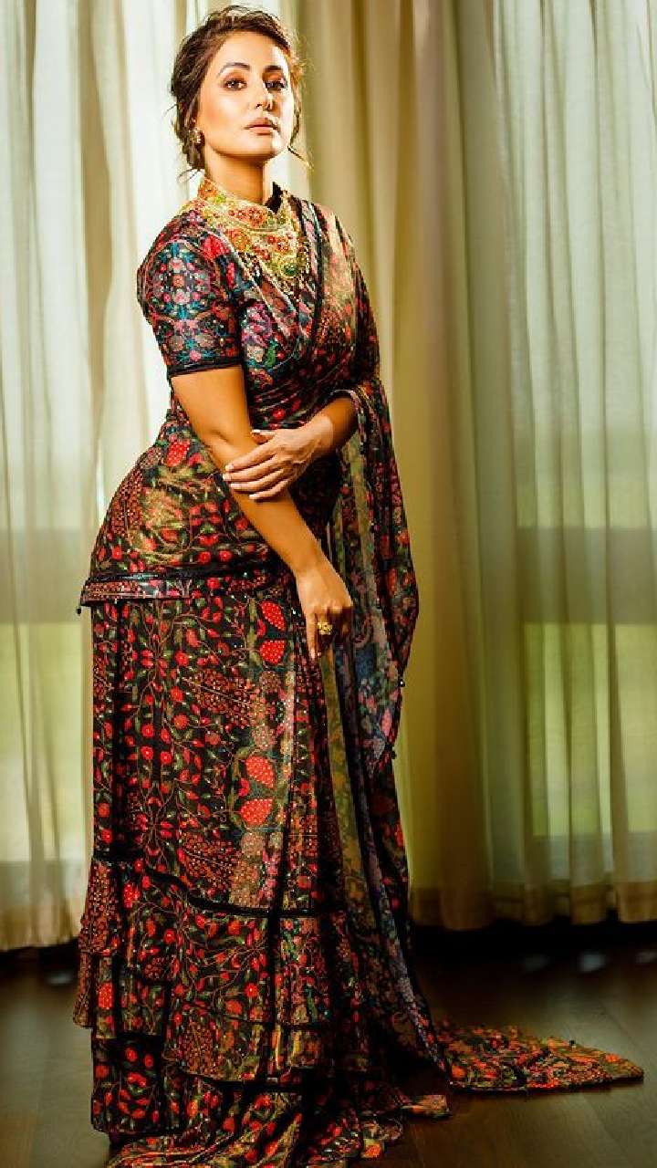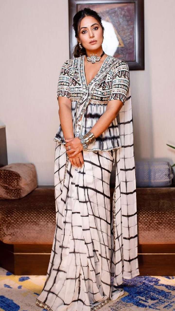 किसी पार्टी के लिए अगर आप साड़ी लुक सर्च कर रहे हैं, तो हिना खान का यह इंडो वेस्टर्न साड़ी लुक परफेक्ट है।