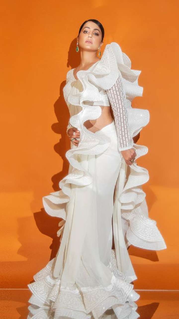 आज कल रफल साड़ीयों का क्रैज बहुत बढ़ गया है। हिना खान की यह व्हाइट कलर की रफल साड़ी से भी आप इंस्पिरेशन ले सकते हैं।