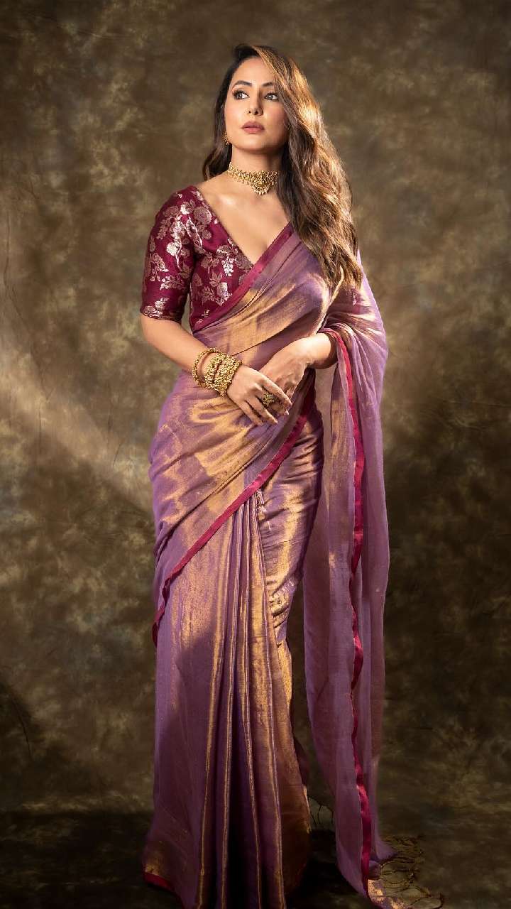 टिशू साड़ी भी आजकल काफी फैशन में हैं। ऐसे में हिना खान की बेबी पिंक टिशू साड़ी को भी स्टाइल कर सकती हैं। इसके साथ डिफरेंट कलर का स्ट्रैपी ब्लाउज पेयर किया जा सकता है।