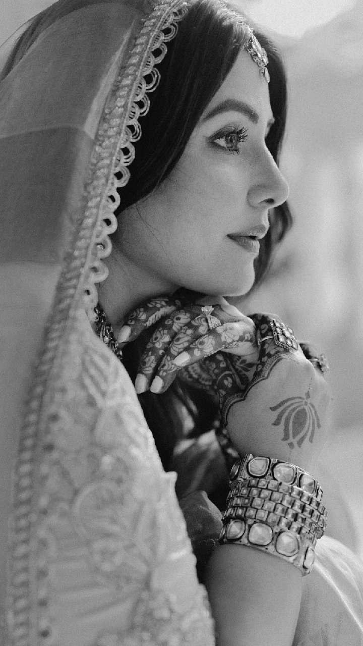 फोटोज में हिना 'दुल्हन' के रूप में बेहद खूबसूरत लग रही हैं। उन्होंने ओपन हेयर्स के साथ अपने दुल्हन लुक को पूरा किया था।