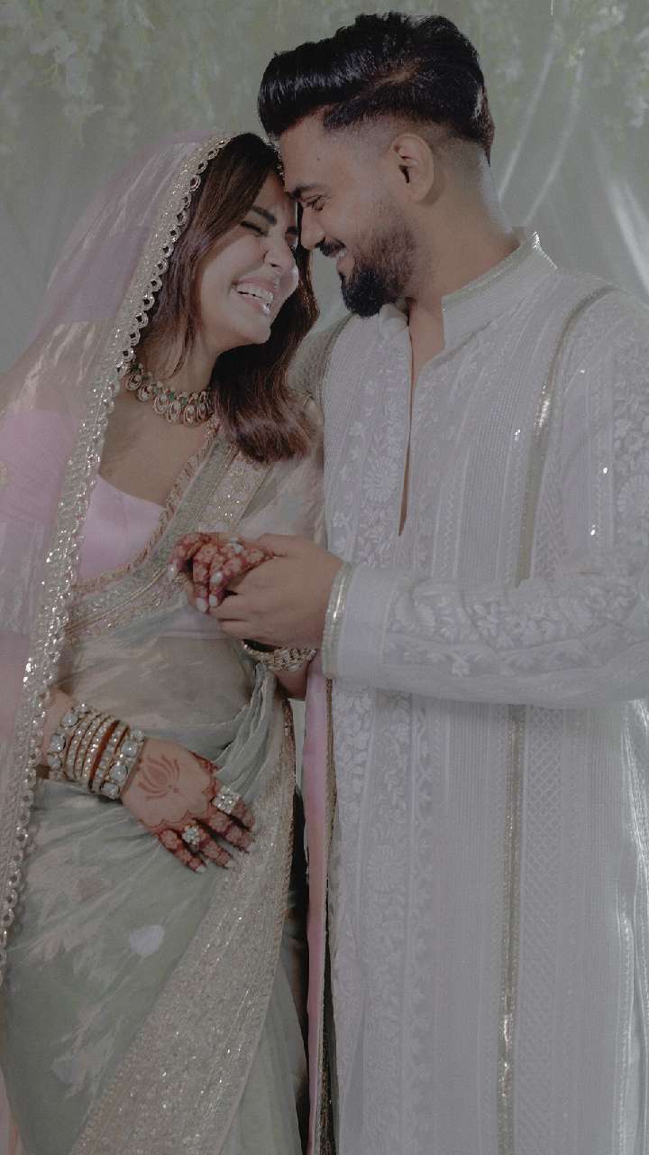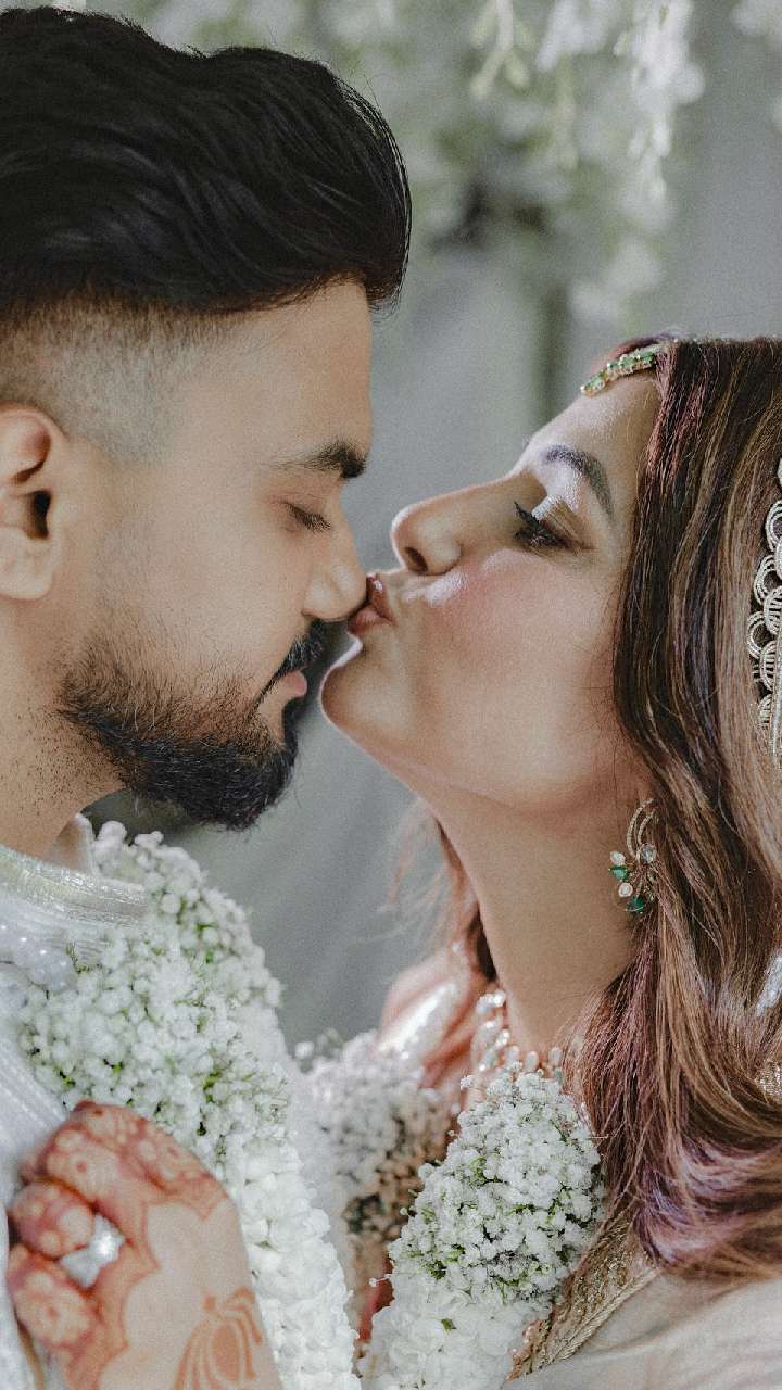 तस्वीर में रॉकी अपनी वाइफ यानी हिना खान को हाथों पर चूमते हुए नजर आ रहे है। साथ ही, दोनों ने शादी की तस्वीरें शेयर करते हुए प्यार सा मैसेज भी लिखा।