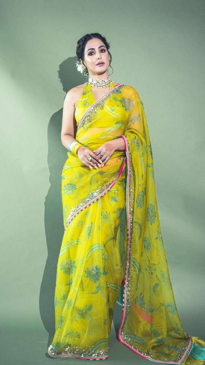 इस ग्रीन फ्लोरल प्रिंट साड़ी विद हाल्टर नेक ब्लाउज में हिना काफी ग्लैमरस लग रही हैं।