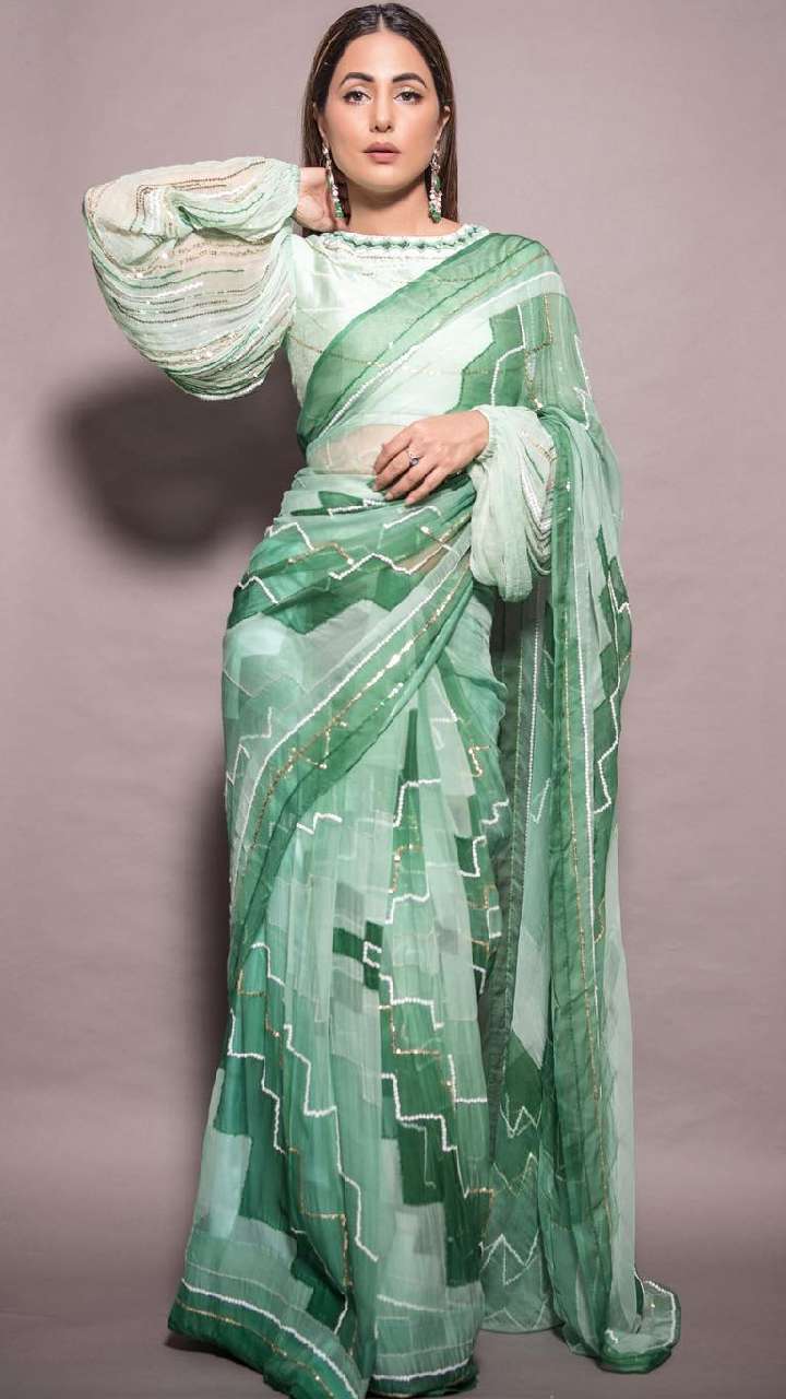 हिना खान इस ग्रीन सेक्विन लेयर साड़ी विद बलून स्लीव्स ब्लाउज में काफी अट्रैक्टिव लुक दे रही है।