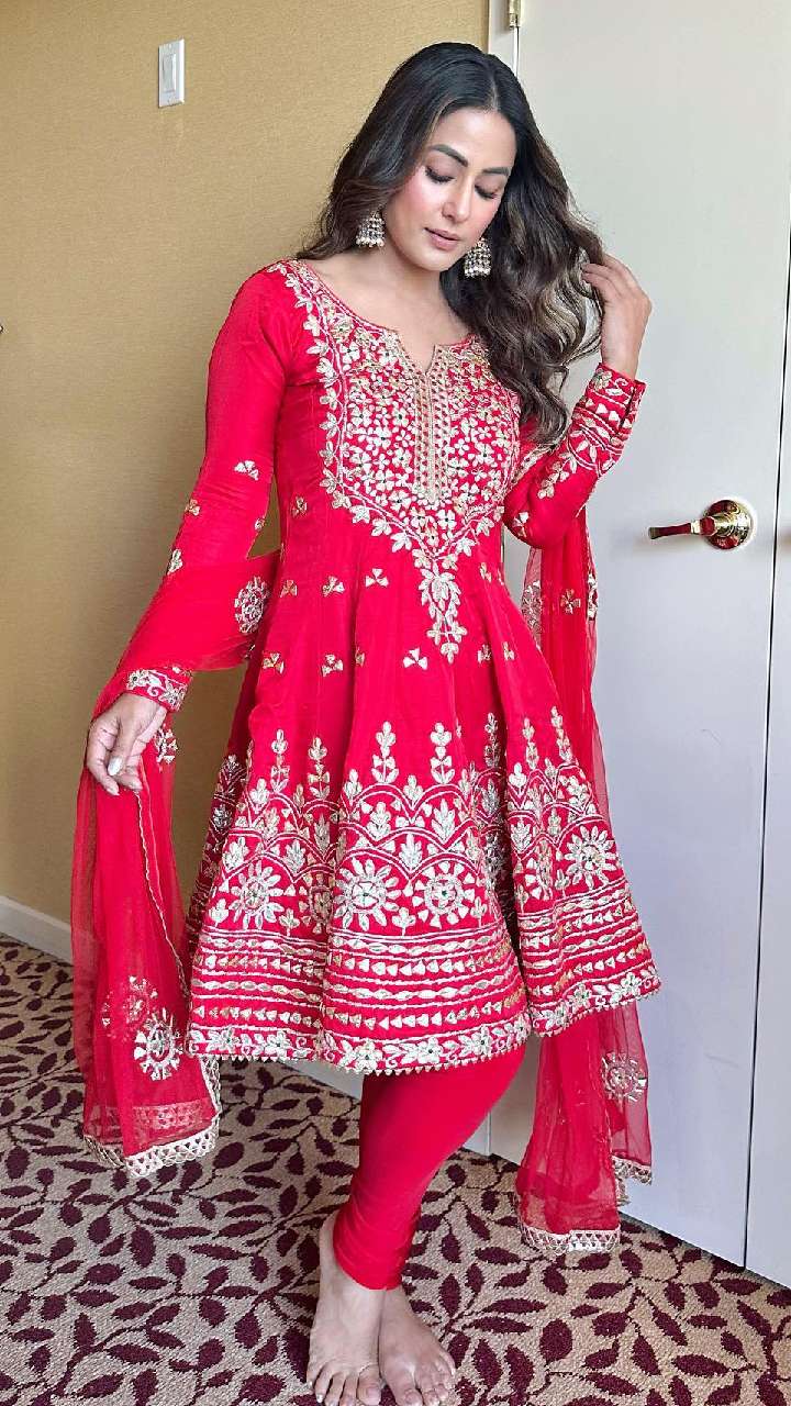 हिना खान सूट में बहुत सुंदर लगती हैं। अनारकली कुर्ता के साथ एक्ट्रेस ने लेगिंग पेयर की है और एक्ट्रेस का ये लुक शानदार लग रहा है।