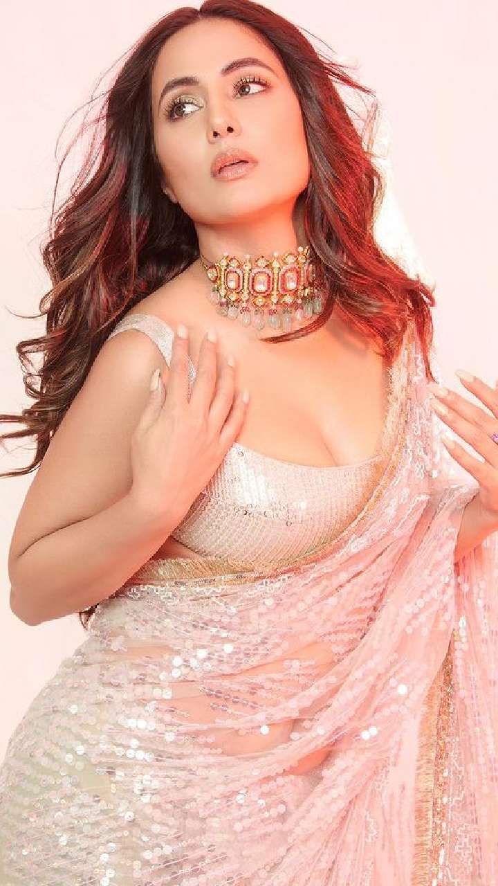 टीवी पर संस्कारी बहू के रूप में दिखने वाली हिना खान का ये रिवीलिंग ब्लाउज संग शिमरी साड़ी लुक बेहद हॉट है।