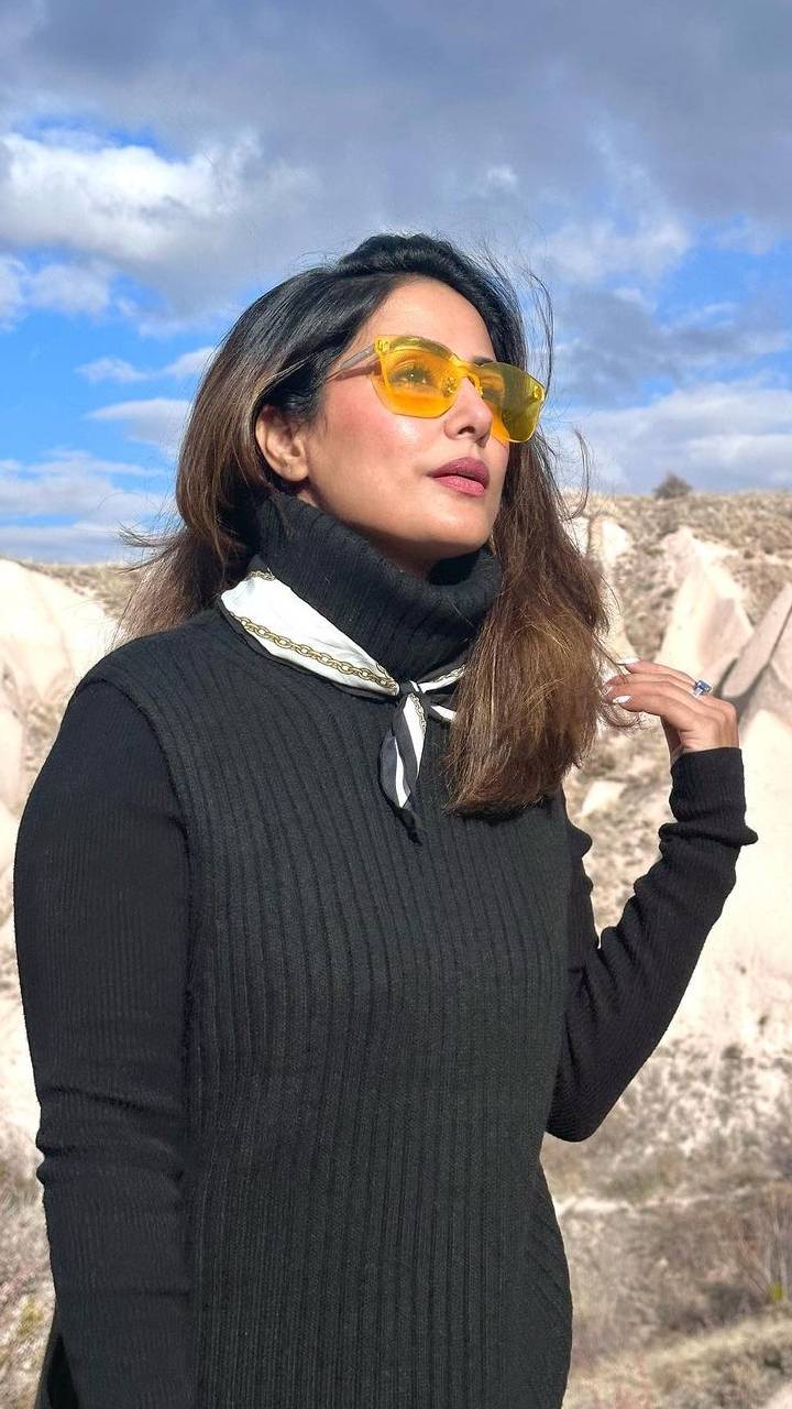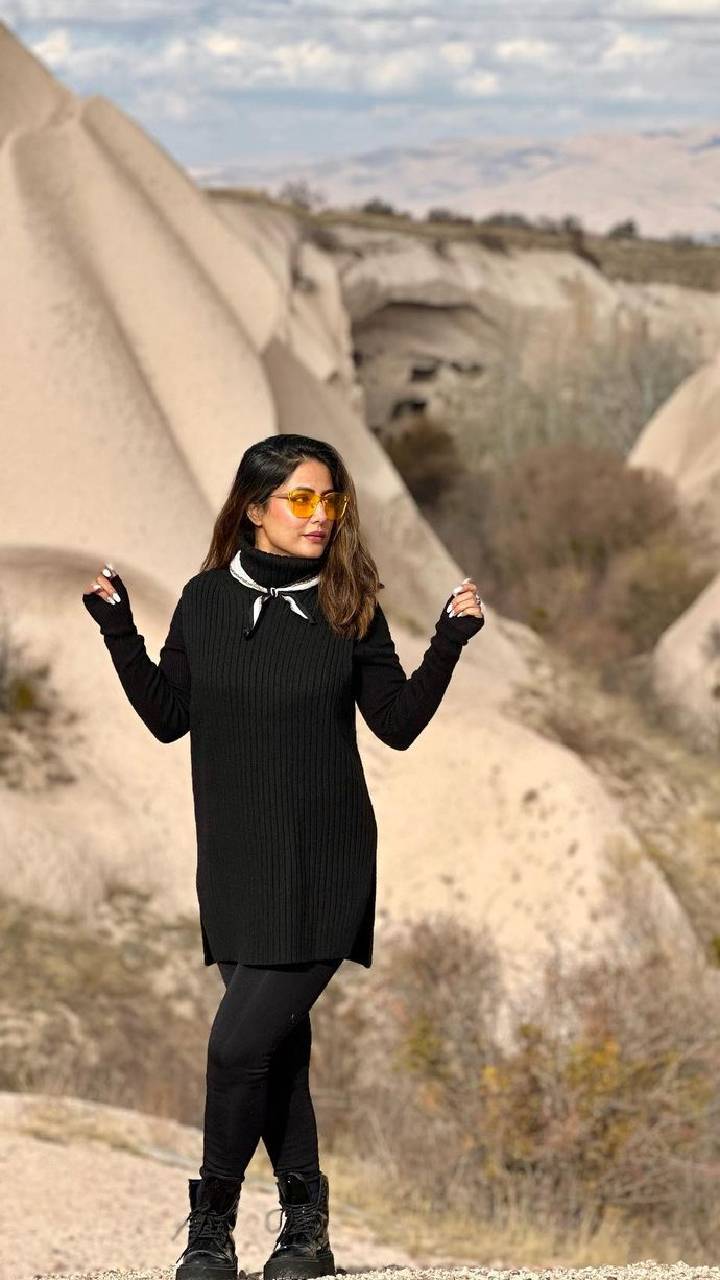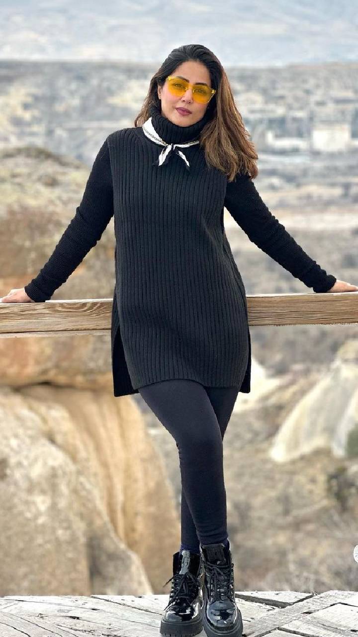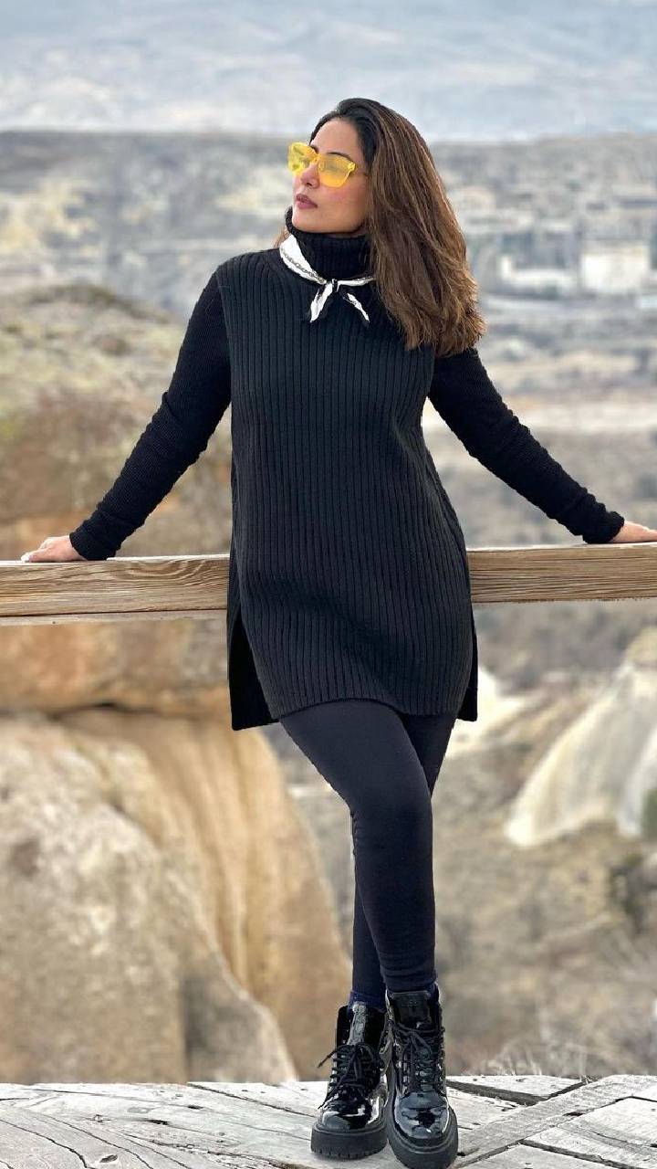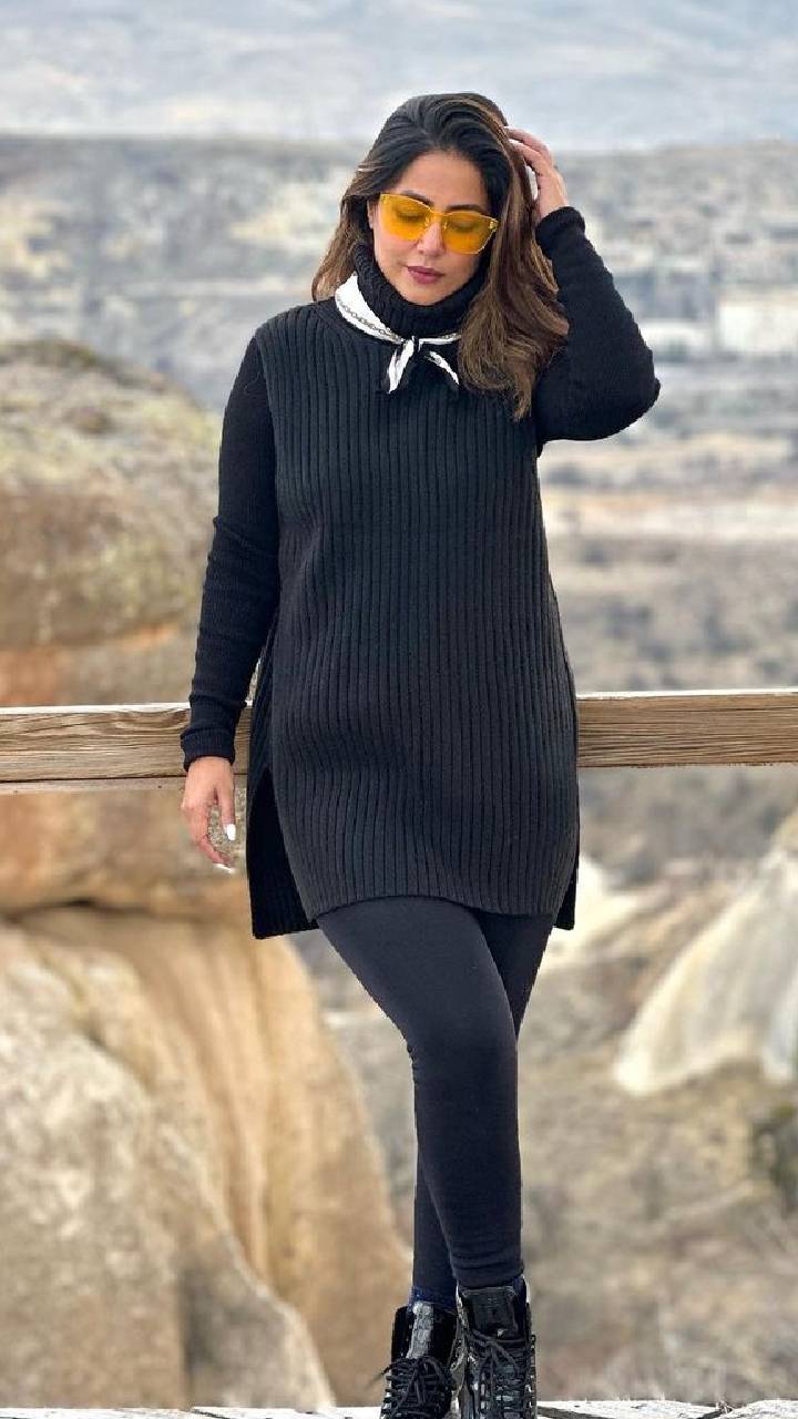 ब्लैक कलर के टर्टल नेक स्वेटर और पैंट में हिना का ये विंटर लुक उनके फैंस को काफी पसंद आ रहा हैं।