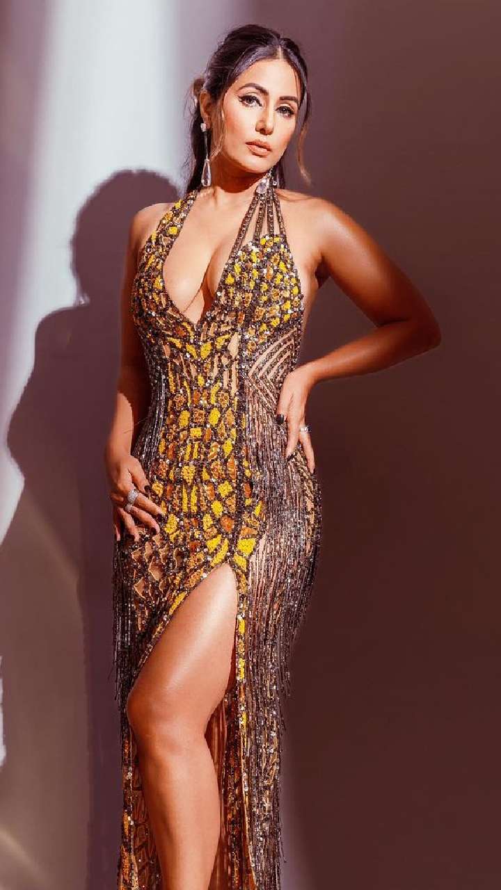 फैंस हिना खान के इस शिमरी डीपनैक गाउन लुक से अपनी नजरें नहीं हटा पा रहे थे।