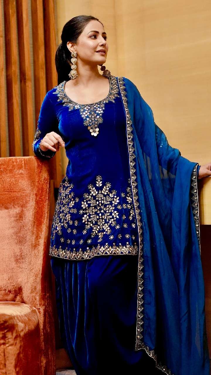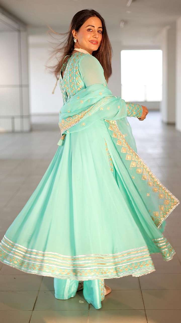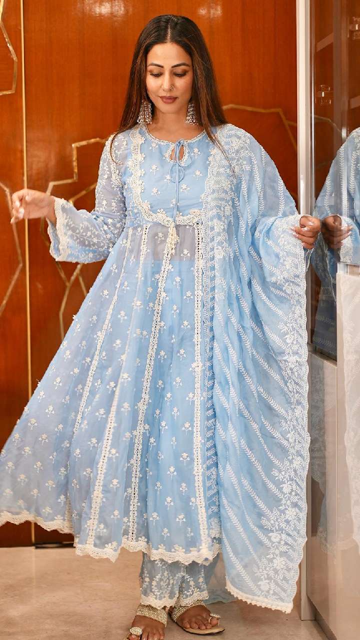 आप किसी फंक्शन में लाइट सूट पहनना चाहती हैं, तो हिना खान की तरह ही स्काई ब्लू कलर का फ्लोरल चिकनकारी सूट ट्राई कर सकती हैं।