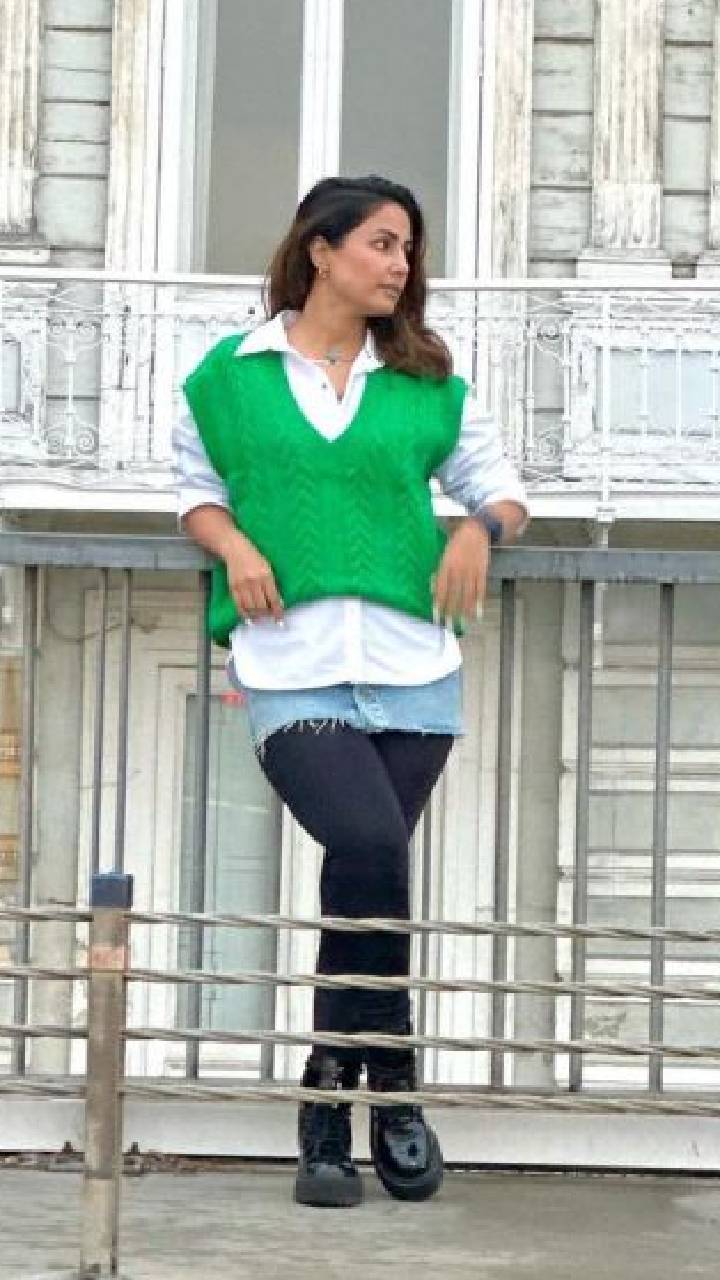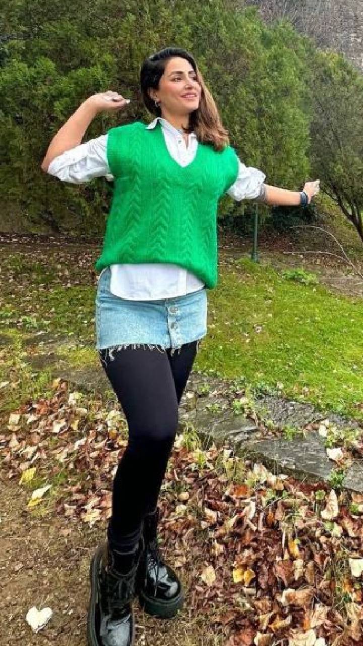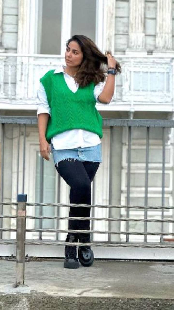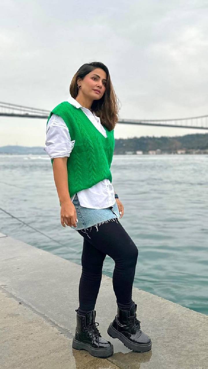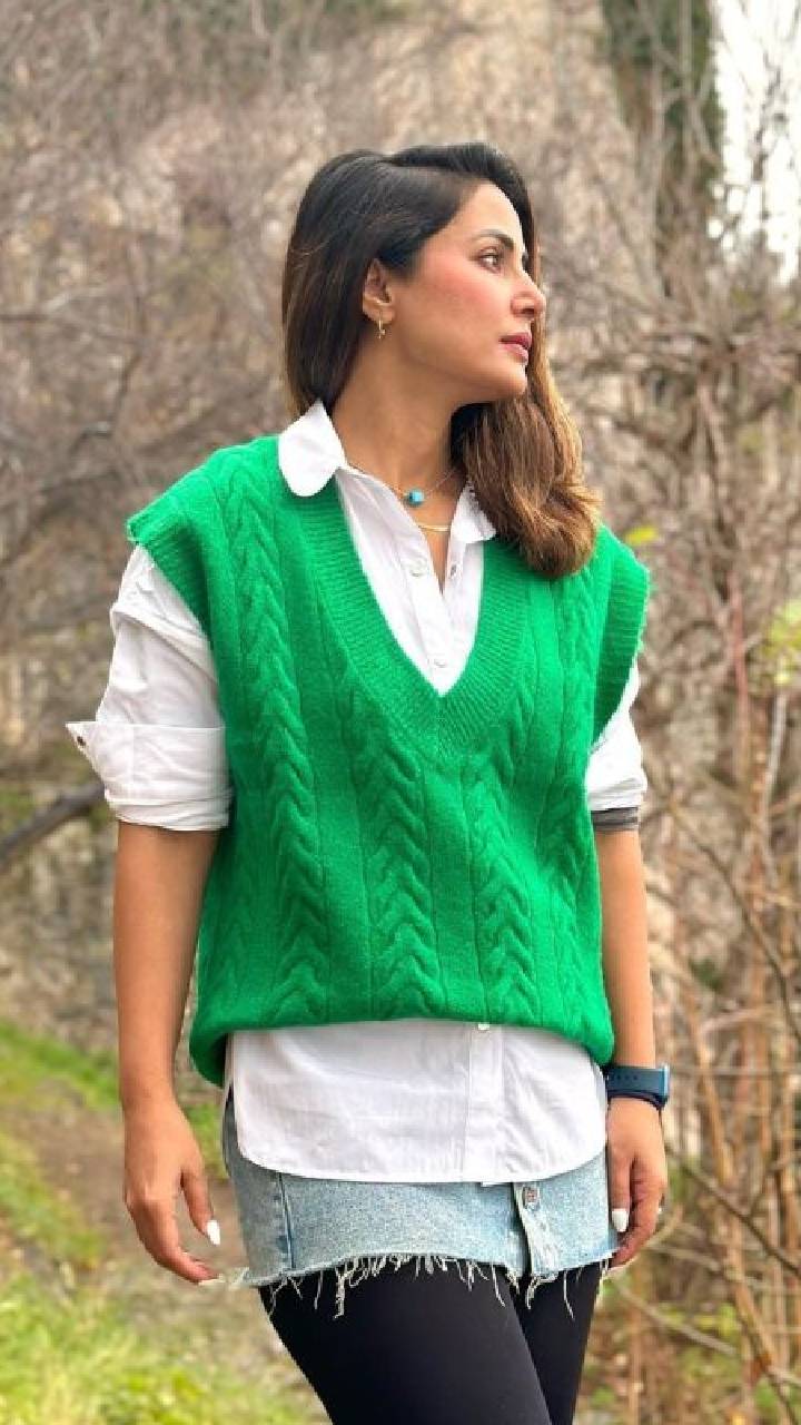 ग्रीन कलर के स्वेटर में हिना ने अपना लेटेस्ट विंटर लुक शेयर किया हैं।
