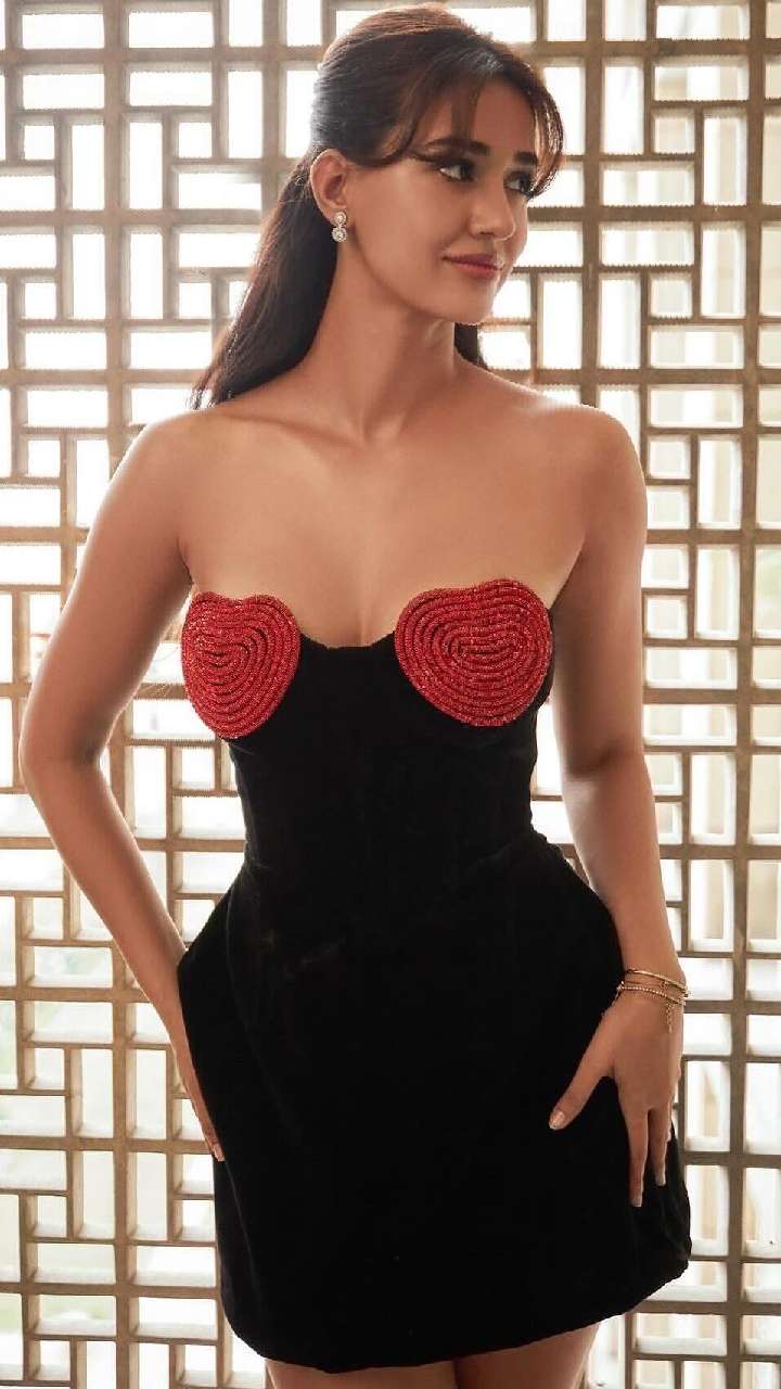 Disha ने ब्लैक लेदर ड्रेस को डार्क रेड लिपस्टिक के साथ स्टाइल किया है, जो देखने में बेहद एलिगेंट लुक दे रहा है। यंग गर्ल्स कर्ली हेयर स्टाइल से लुक को कंप्लीट और अट्रैक्टिव बना सकती हैं।
