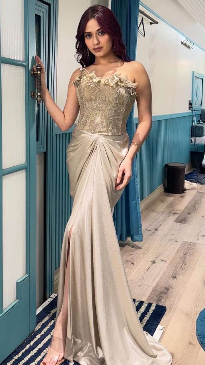 अगर आप नाईट पार्टी के लिए आउटफिट सर्च कर रही हैं, तो जान्हवी कपूर के इस ड्रेस से इंस्पिरेशन ले सकती है। एक्ट्रेस ने गोल्डन कलर का ऑफ शोल्डर गाउन पहना है, जिसमें वह काफी हॉट लग रही हैं।