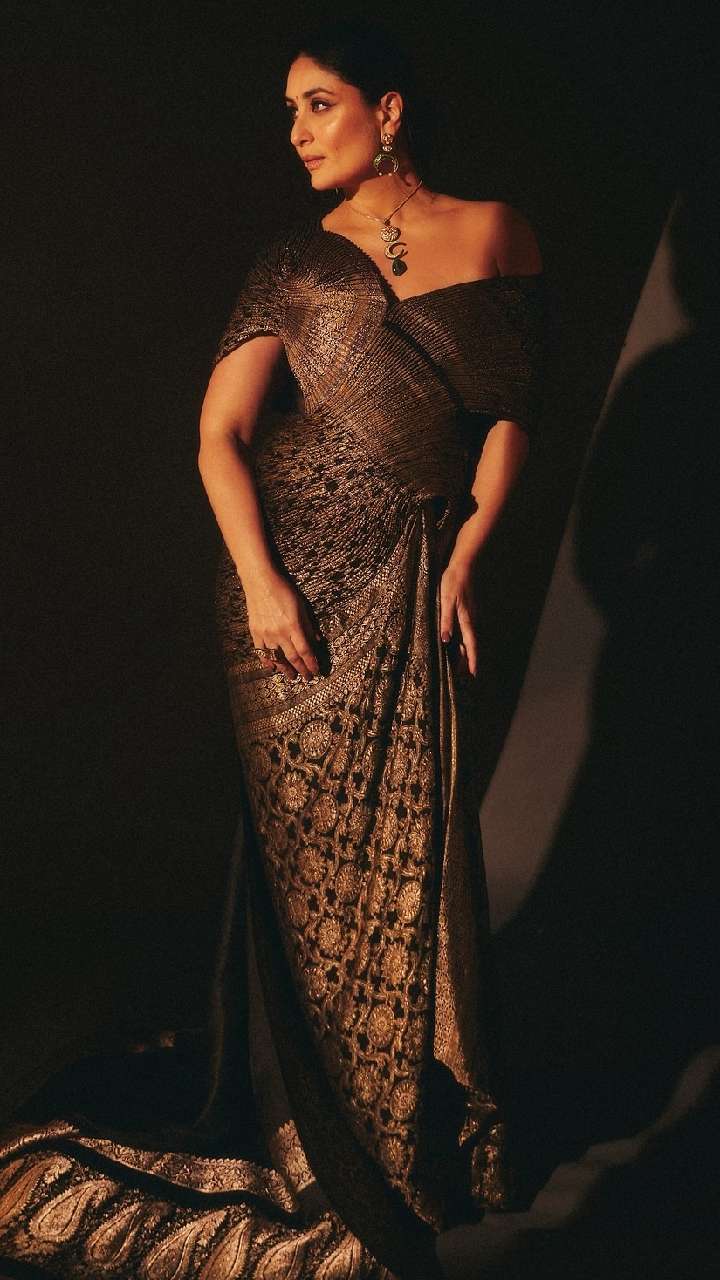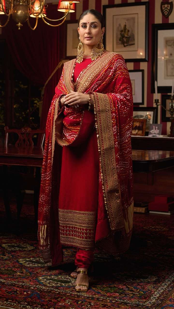 एक्ट्रेस रेड कलर के प्लेन गोल्डन बॉर्डर कुर्ती बंधेज दुपट्टे में बेहद खूबसूरत लग रही हैं। अगर आप किसी शादी या फंक्शन के लिए इंडियन लुक चाहती हैं, तो करीना के इस ड्रेस को एक बार जरूर ट्राई करें।