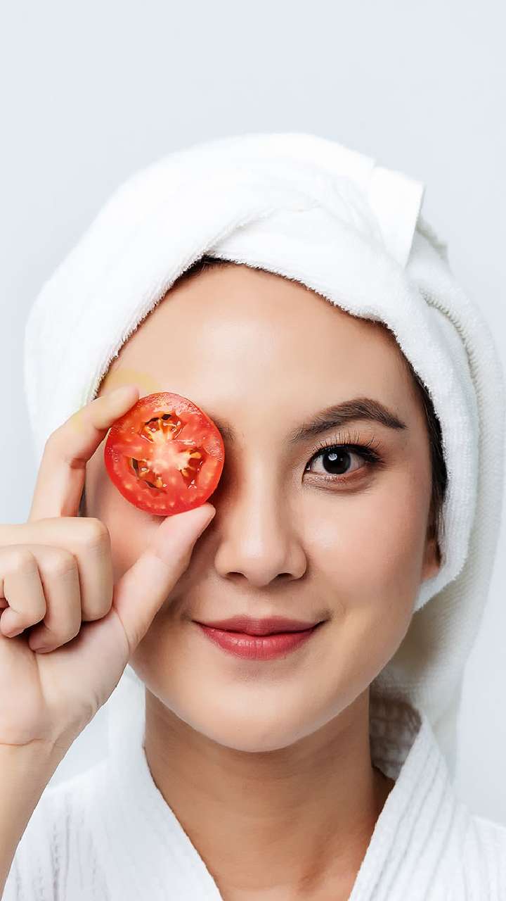 टमाटर में ब्लीचिंग गुण होता है। इसे दो हिस्सों में काटकर चेहरे पर रगड़ने से निखार आता है। इससे चेहरे पर चमक आ जाती है।