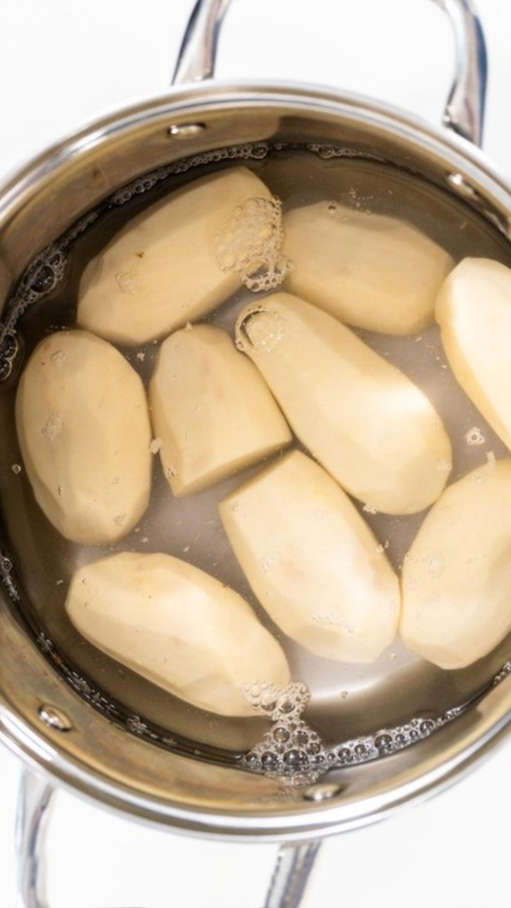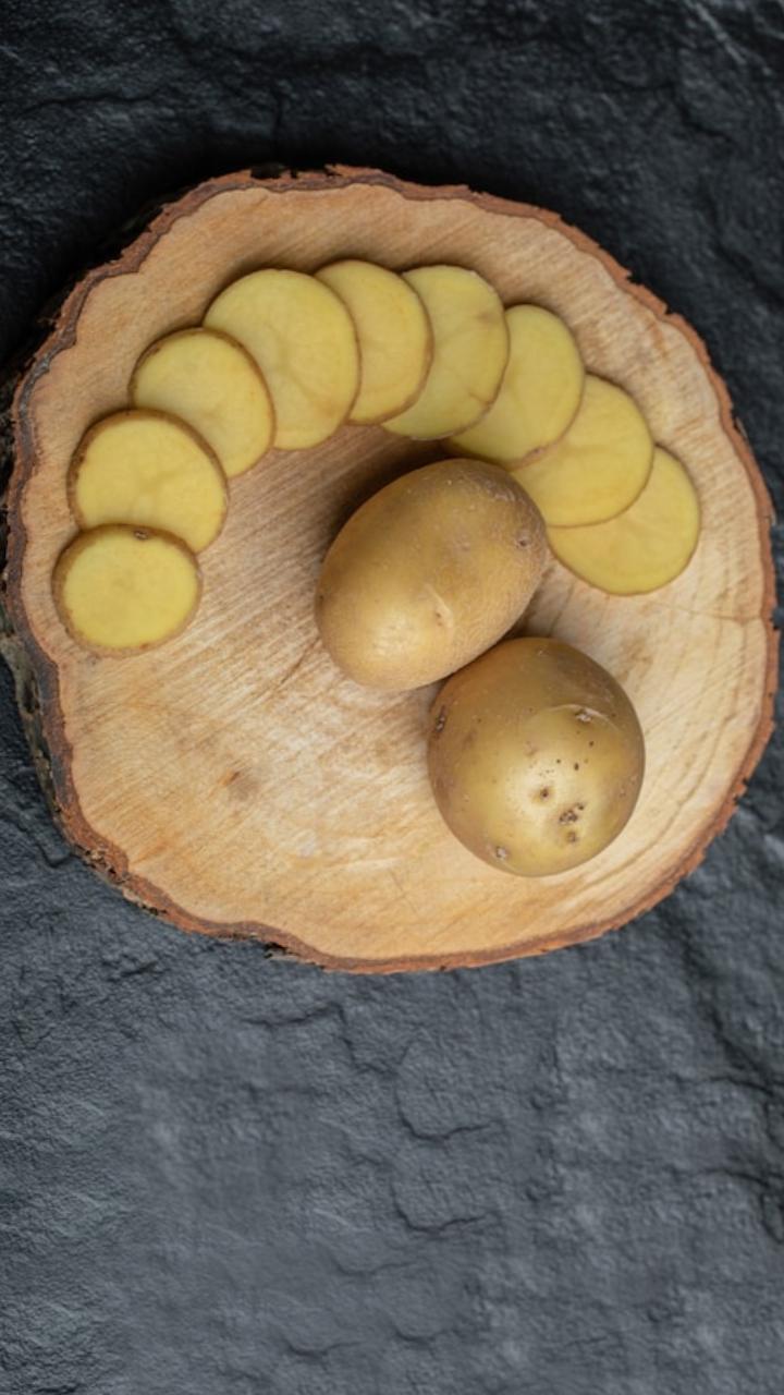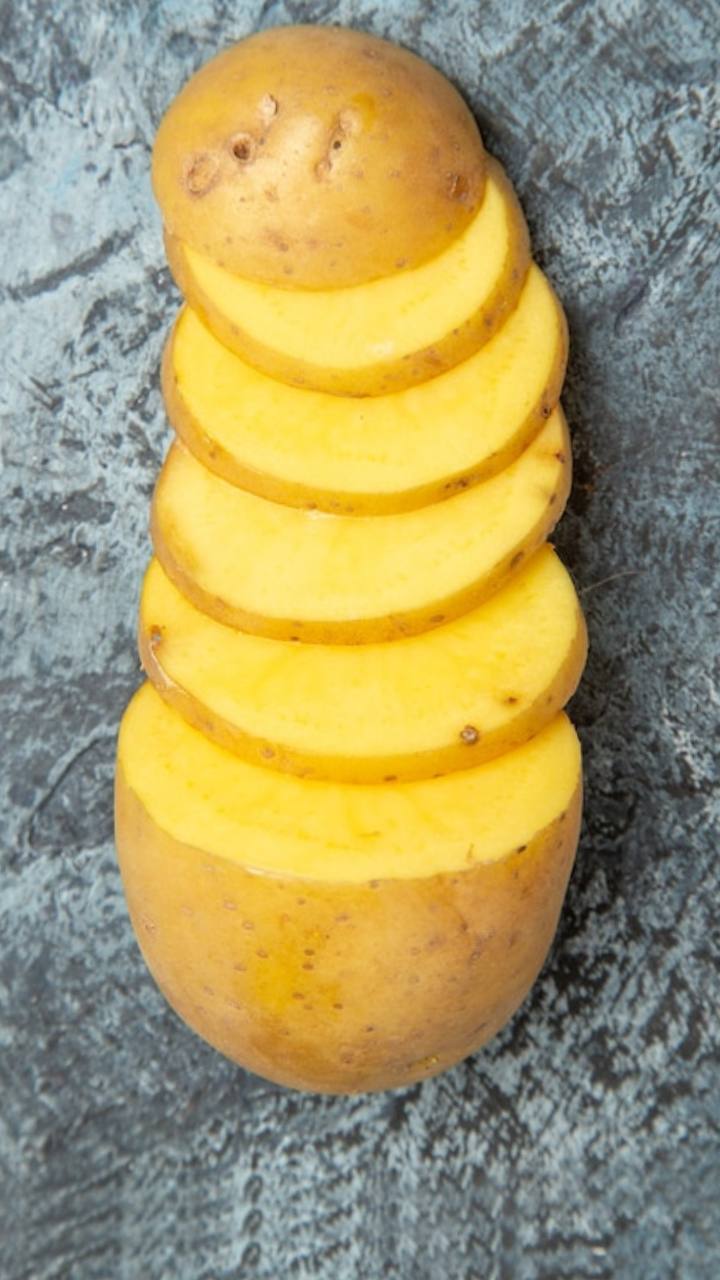 मीडियम आकार के आलू लें। उन्हें साफ पानी में धोएं । उसके बाद आलू को छीलें और पानी में भिगोकर रख दें। इससे ऑक्सीडेशन प्रक्रिया रुकती है।