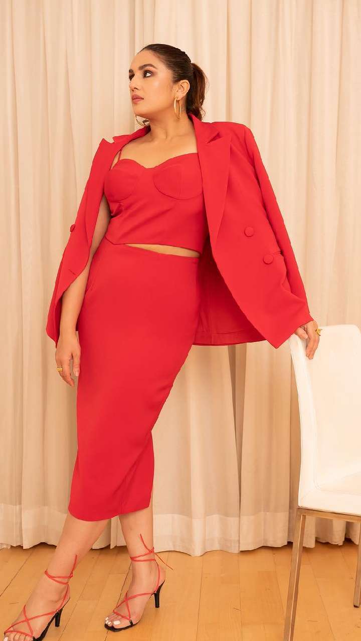 रेड कलर के इस कॉ-ऑर्ड सेट में हुमा काफी हॉट लग रहीं हैं। रेड कलर हर पर्सनालिटी पर अच्छा लगता है।
