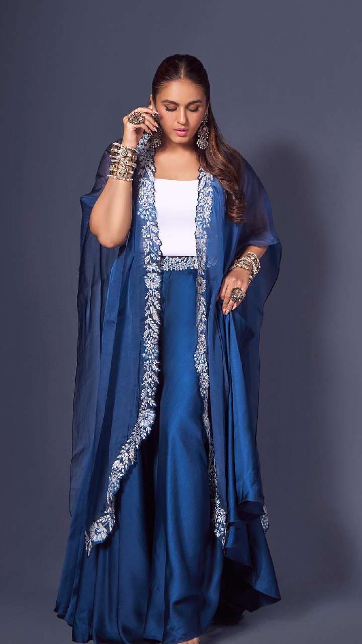 अभिनेत्री की ब्लू प्लेन एम्ब्रॉयडरी श्रग क्रॉप टॉप और पेप्लम प्लाजो ड्रेस काफी ब्यूटीफुल लग रही हैं। इसे आप ऑफिस और किसी भी पार्टी में स्टाइल कर सकती हैं।