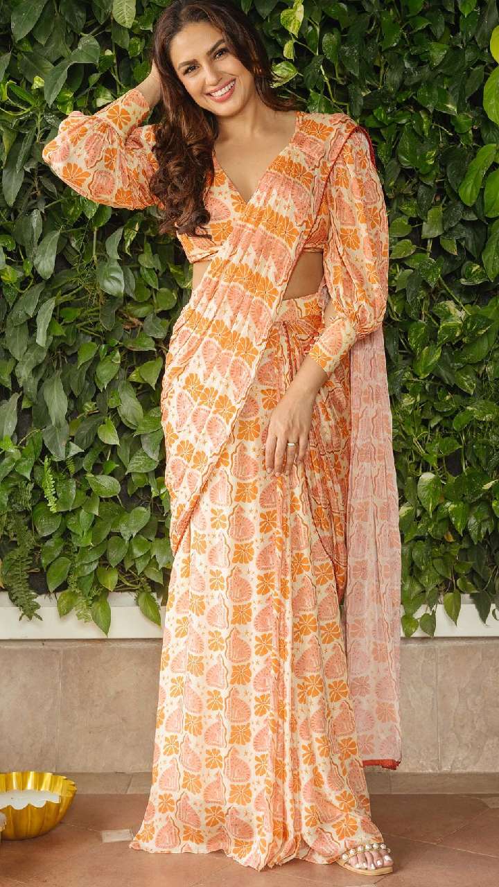 अभिनेत्री का ऑरेंज प्रिंटेड साड़ी पफ़ स्लीव्स ब्लाउज लुक समर सीजन के लिए बेस्ट रहेगा। चबी गर्ल्स इसे जरूर ट्राई करें।
