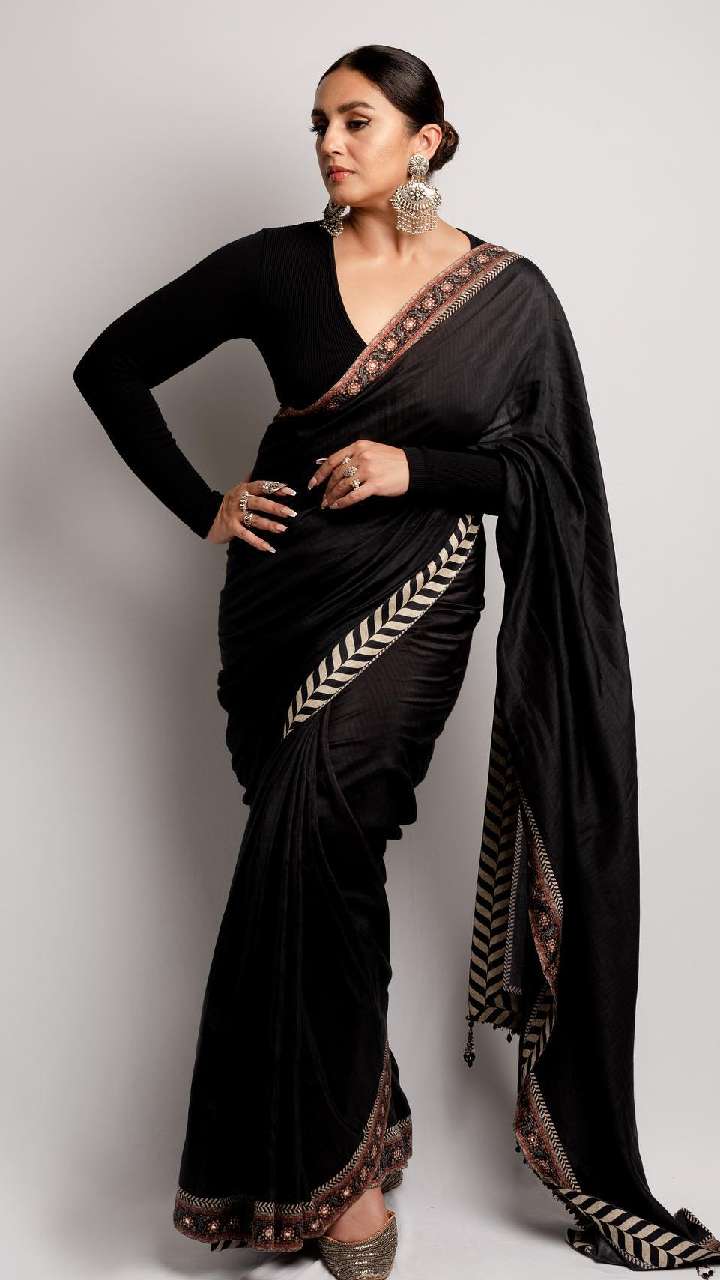 हाल में हुमा ने ब्लैक कलर की सेक्विन नेटिड साड़ी प्लेन फुल स्लीव्स ब्लाउज में अपना गॉर्जियस लुक शेयर किया है। जिसमें वो कयामत ढहा रही हैं।