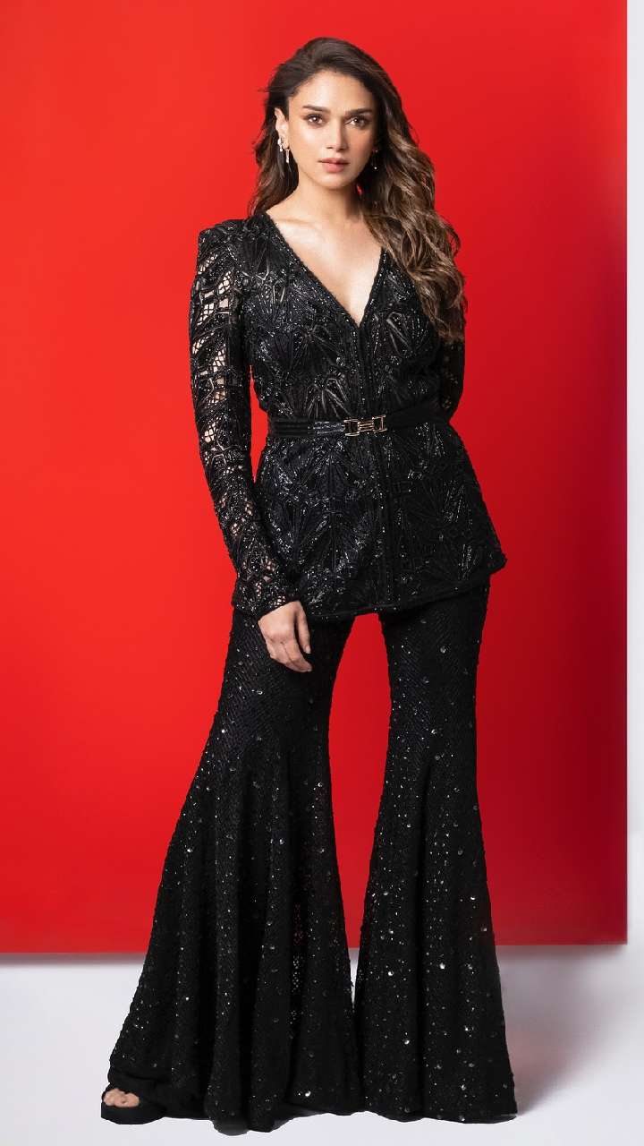 Aditi ने ब्लैक शिमरी इंडो वेस्टर्न को लाइट कर्ली हेयर स्टाइल के साथ कैरी किया है। पार्टी में गॉर्जियस दिखने के लिए आप एक्ट्रेस के लुक को कॉपी कर सकती हैं।