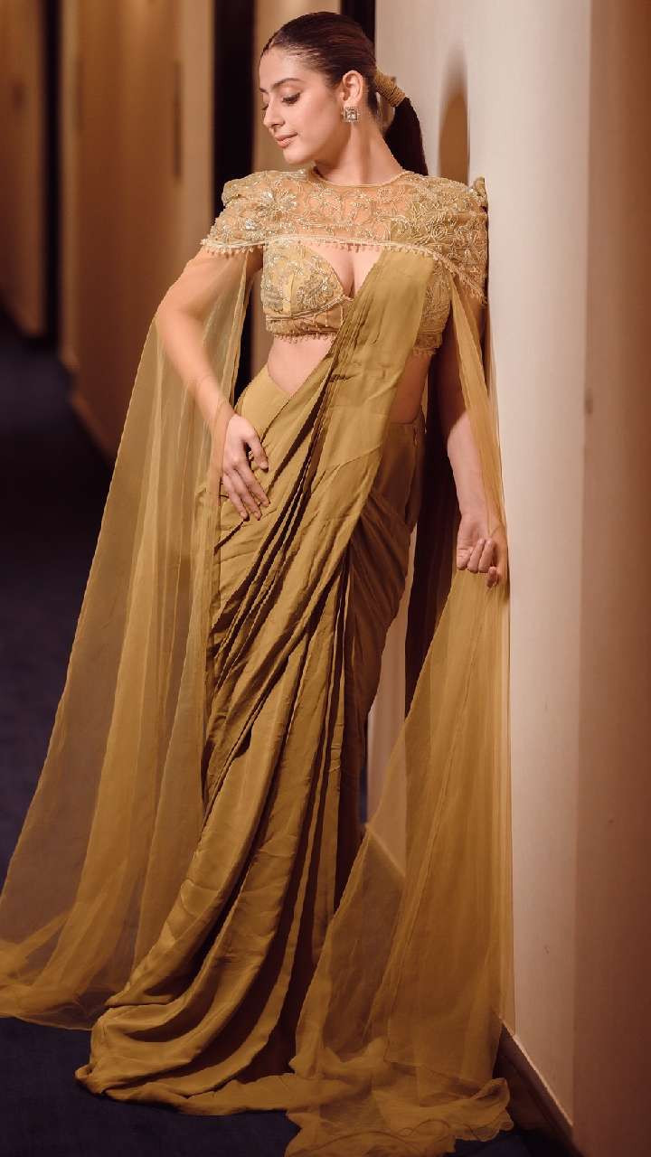 दोस्त की शादी में यंग गर्ल्स इस साड़ी को पहनकर रॉयल लुक कैरी कर सकती हैं। साथ ही, एक्ट्रेस की साड़ी के साथ डिजाइनर श्रग बेहद खूबसूरत और यूनिक लुक दे रहा है।