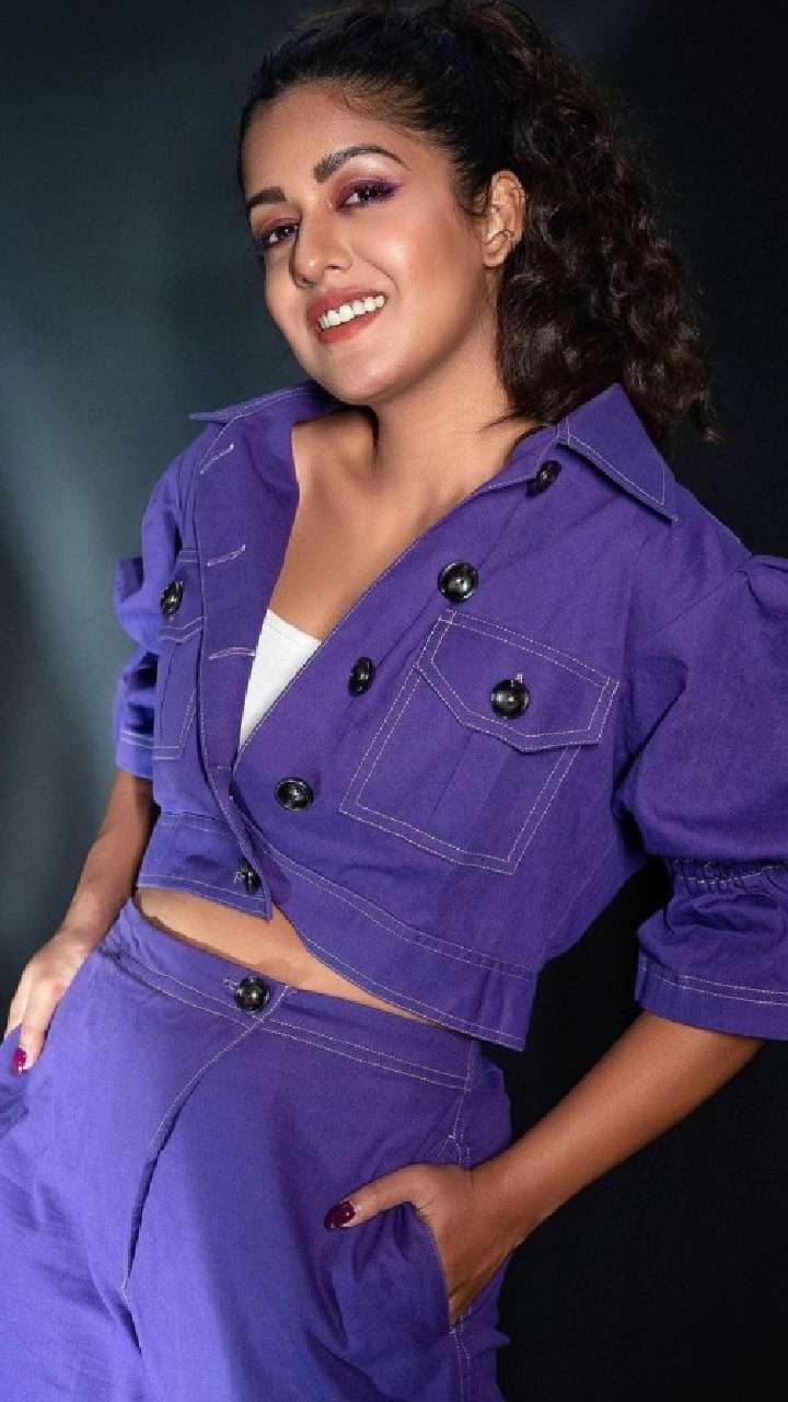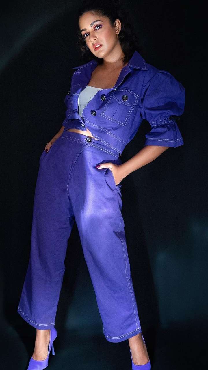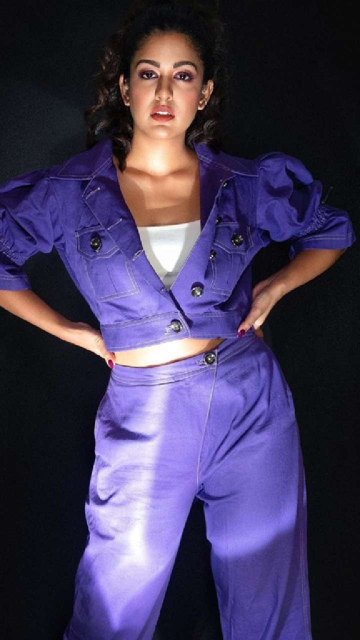 डीवा इस पर्पल कलर के डेनिम ऑउटफिट में बेहद स्टाइलिश लुक दे रही हैं।