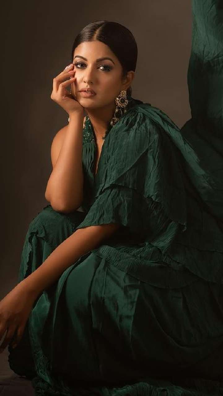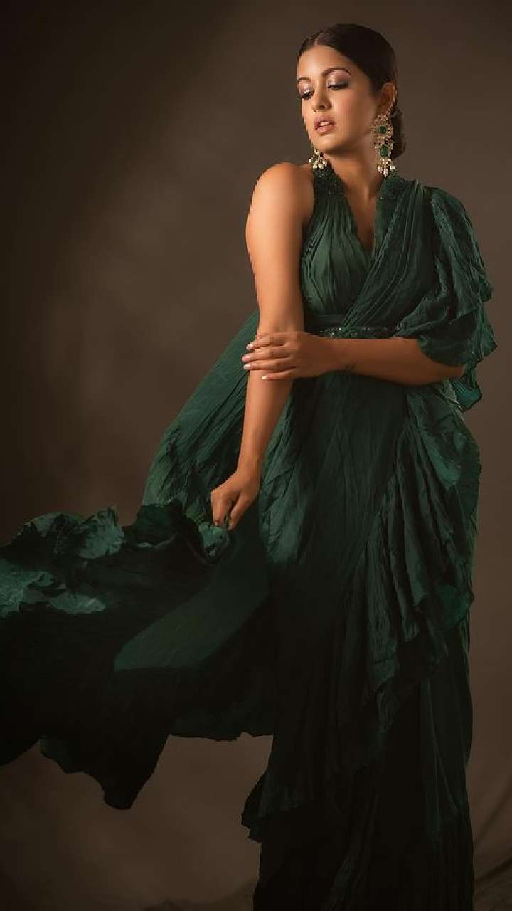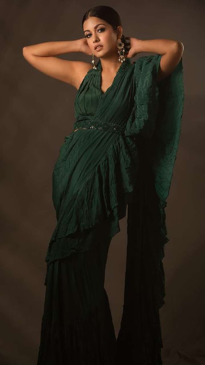 लेटेस्ट पोस्ट में एक्ट्रेस ने इंडो वेस्टर्न स्टाइल में साड़ी पहनी है। इशिता ने ग्रीन फ्रील साड़ी के साथ बेस्ट भी लगाया है।