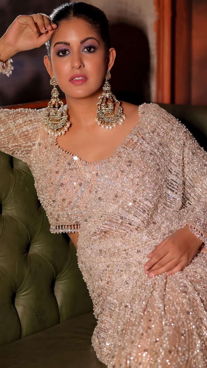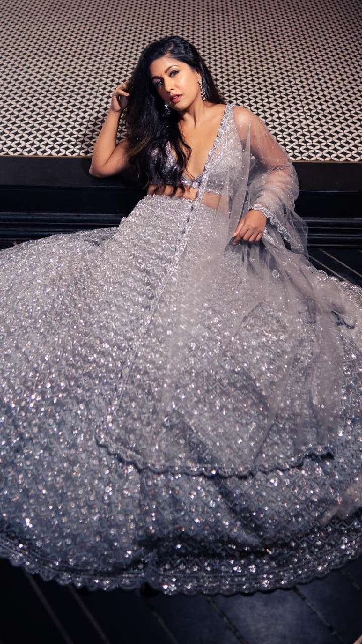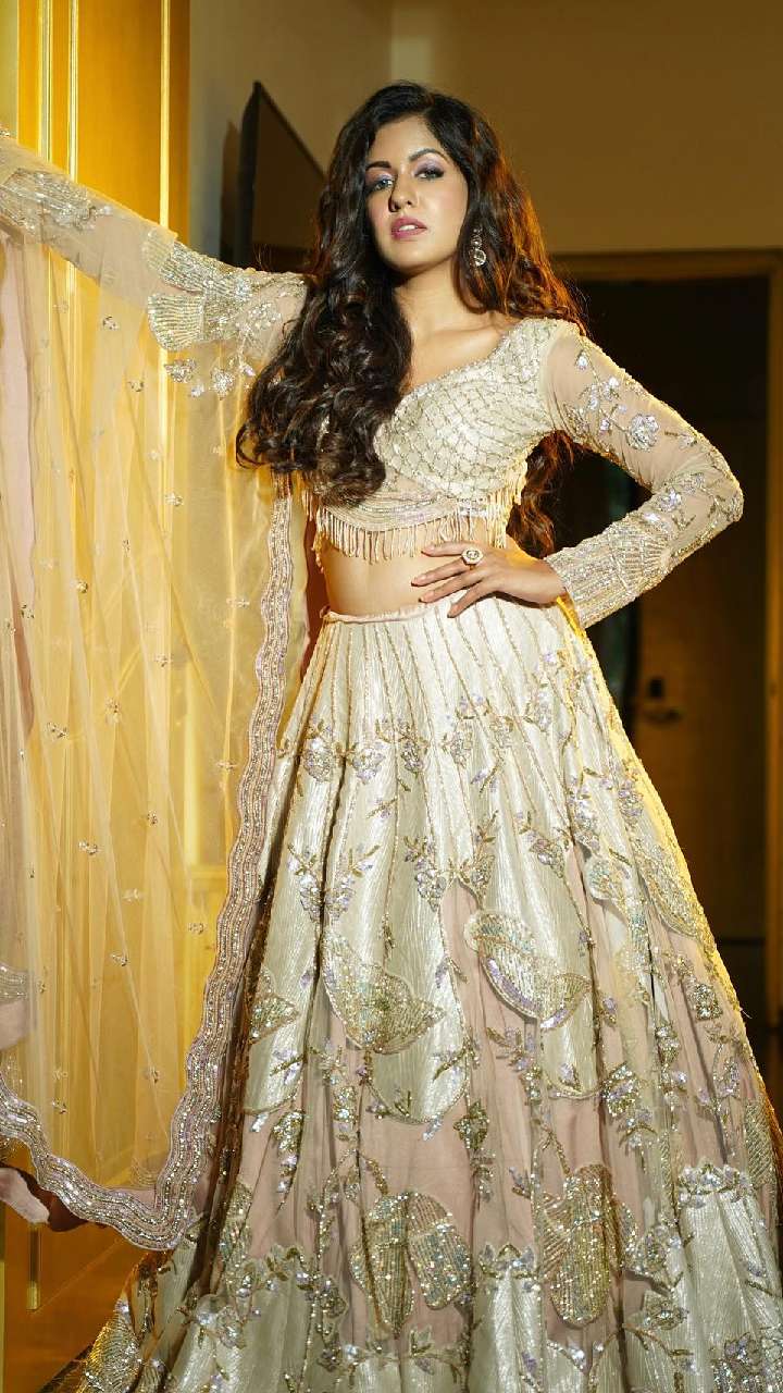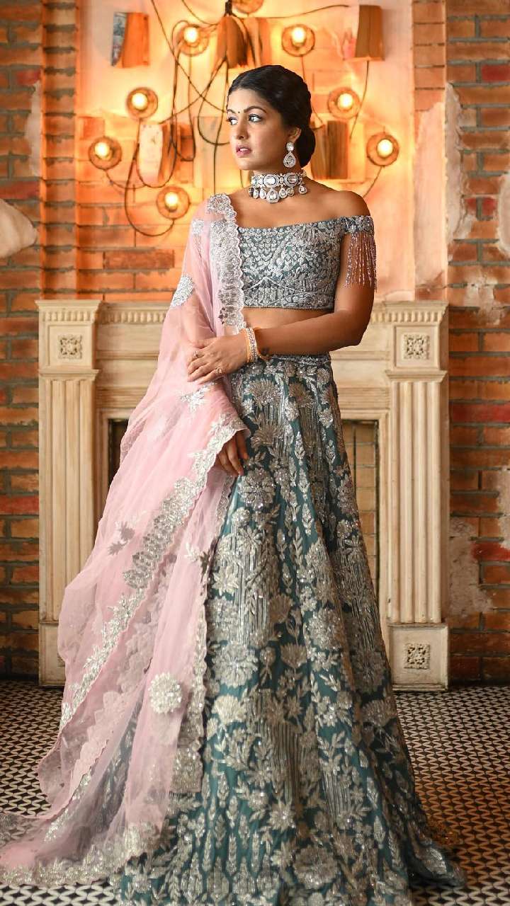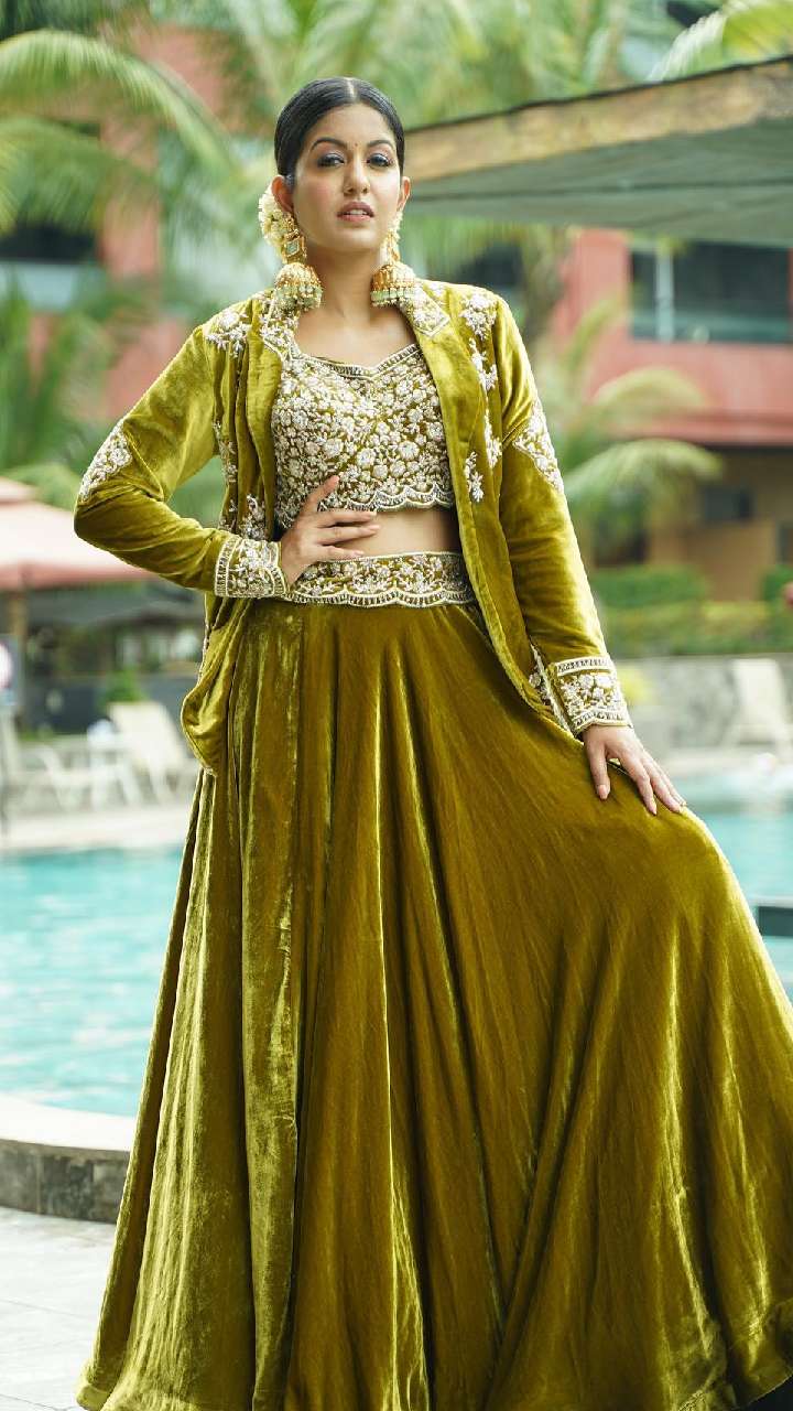 अभिनेत्री ग्रीन कलर के प्लेन वेलवेट लहंगे हैवी वर्क चोली में हुस्न की मल्लिका लग रही हैं। शार्ट हाइट गर्ल्स इसे भी फॉलो कर सकती हैं।