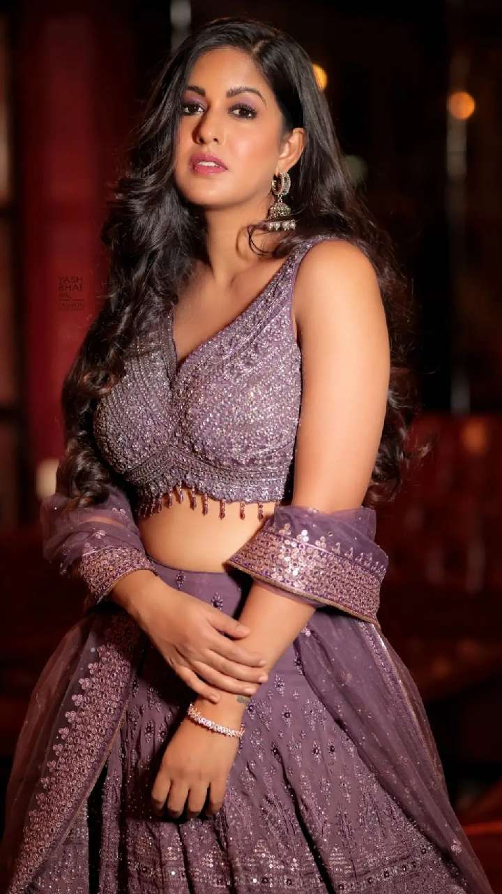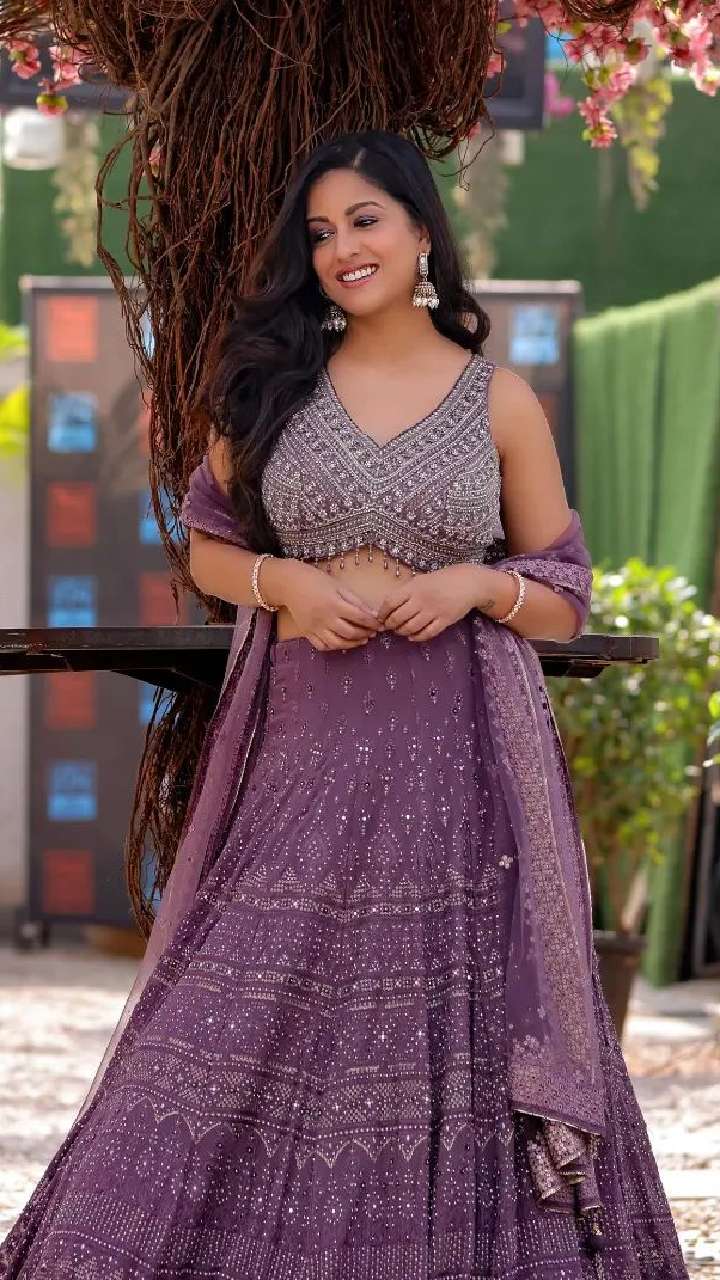 इशिता डार्क पर्पल कलर के लहंगे डीपनैक चोली में बेहद गॉर्जियस लग रही हैं। ये शार्ट हाइट गर्ल्स के लुक में चार चांद लगा देगा।