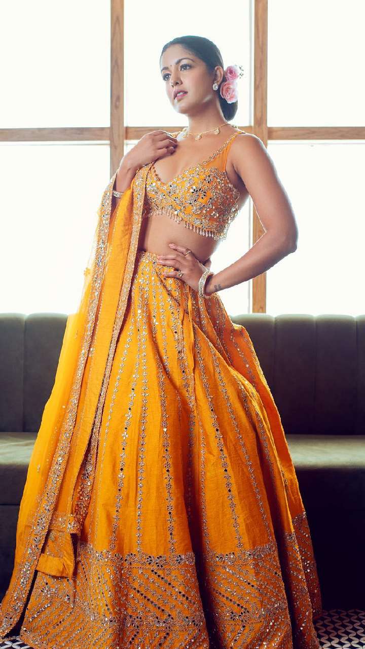 छोटे कद की लड़कियों पर ऐसे प्लेन मिरर वर्क लहंगे भी काफी खूबसूरत लगते हैं। साथ में बिकिनी कट चोली बन हेयर स्टाइल काफी सूट कर रही है।