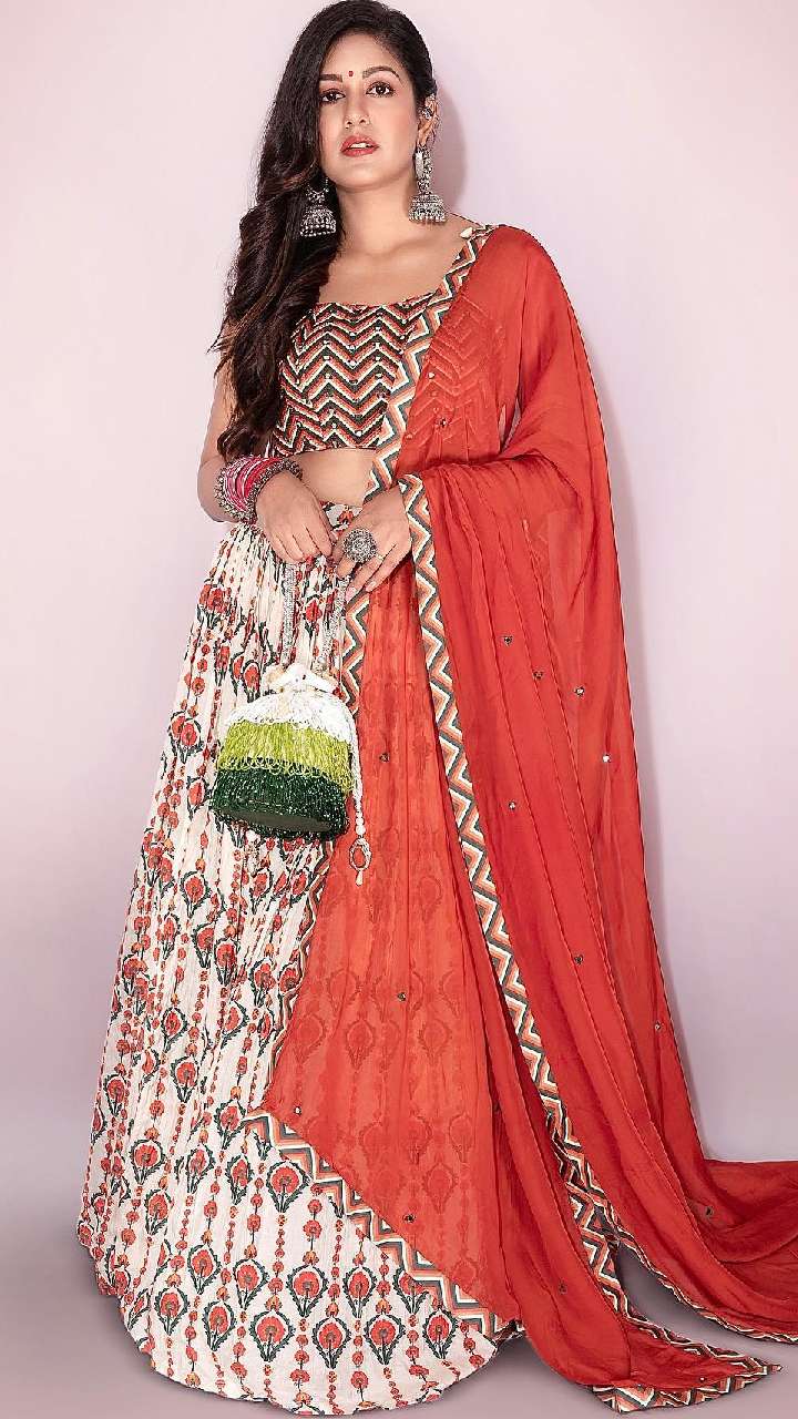 वेडिंग में छोटे कद की लड़कियों के लिए एक्ट्रेस के जैसा कंट्रास्ट कलर फुल वर्क लहंगा भी अच्छा ऑप्शन है। इसके साथ उनकी ऑफ शोल्डर चोली हॉट लग रही है।