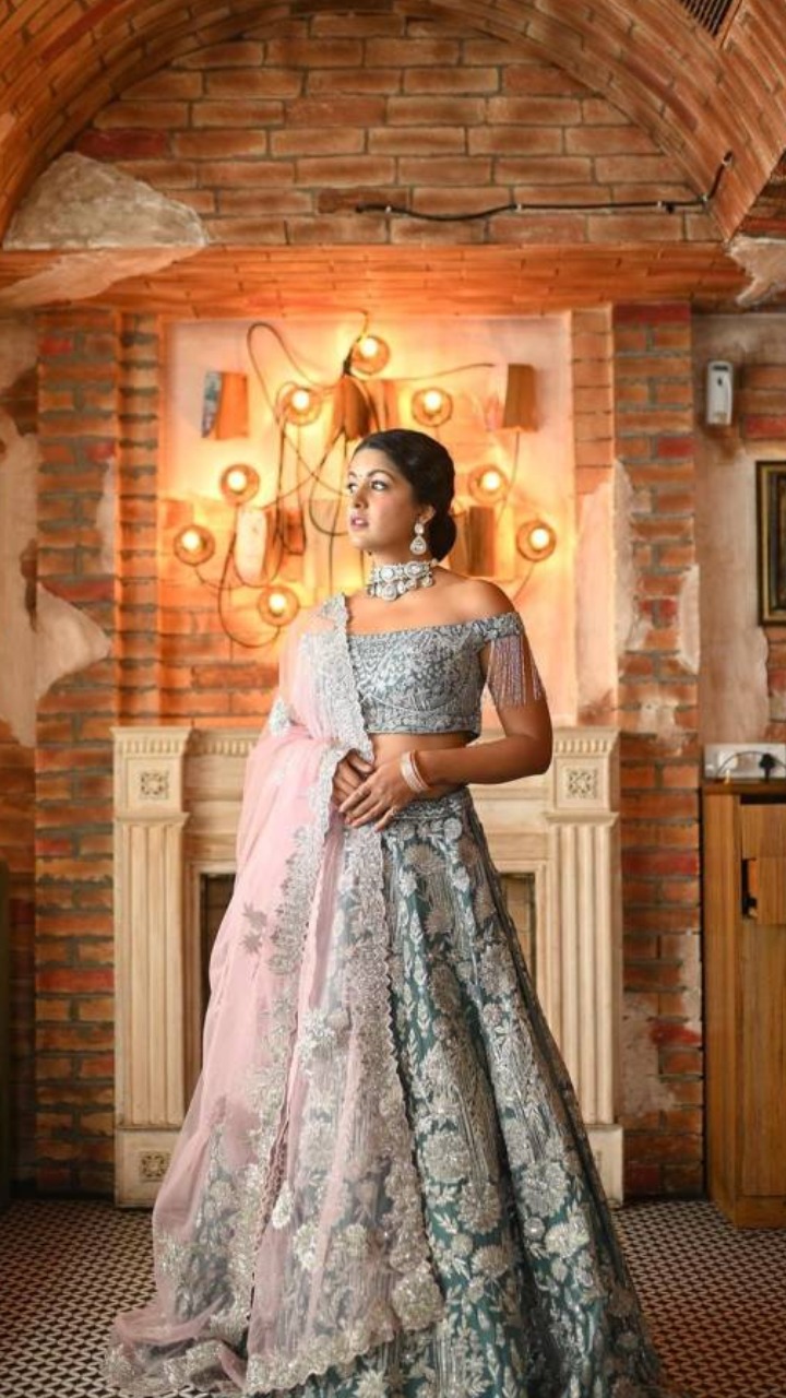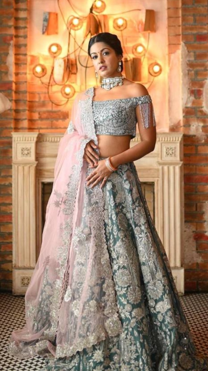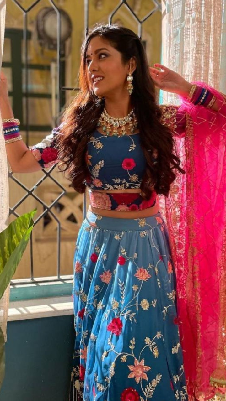 इशिता ने तस्वीर में ब्लू कलर का एंब्रॉयडर्ड लहंगा के साथ पिंक कलर की चुनरी कैरी की है। एक्ट्रेस का ये कंट्रास्ट कॉम्बिनेशन उनके लुक को और आकर्षक बना रहा हैं।