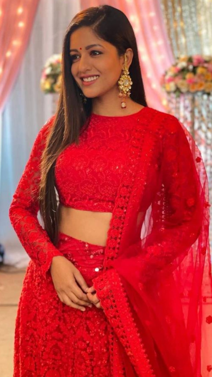 रेड कलर का ये नेट एम्ब्रॉयडर्ड लहंगा सेट इशिता की सुंदरता में चार चांद लगाने का काम कर रहा हैं।अगर आप शादी के लिए सिंपल लुक ढुंढ रहे है तो ये लहंगा आपकी पसंद हो सकता हैं।