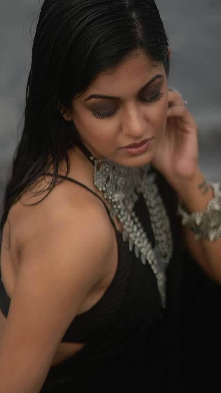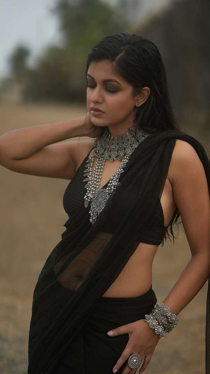 तस्वीर में इशिता ने ब्लैक कलर की साड़ी, डीप नेक स्लीवलेस ब्लाउज और ऑक्सिडाइज्ड ज्वेलरी पहनी हुई हैं।