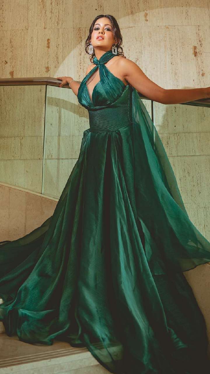 अभिनेत्री का ग्रीन फ्लेयर क्रिस क्रॉस गाउन लुक भी बेहद सिजलिंग लुक दे रहा है। कॉकटेल पार्टी के लिए ये लुक बेस्ट है।