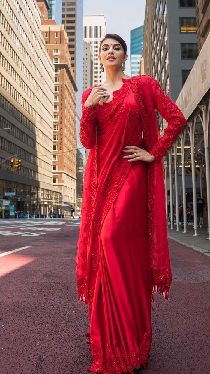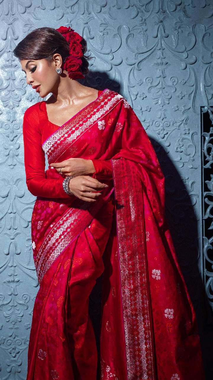 जैकलीन फर्नांडिस का ये रेड साड़ी लुक काफी ज्यादा प्यारा है। इस साड़ी लुक को एक्ट्रेस ने गुलाब के फूल लगाकर कंप्लीट किया है।