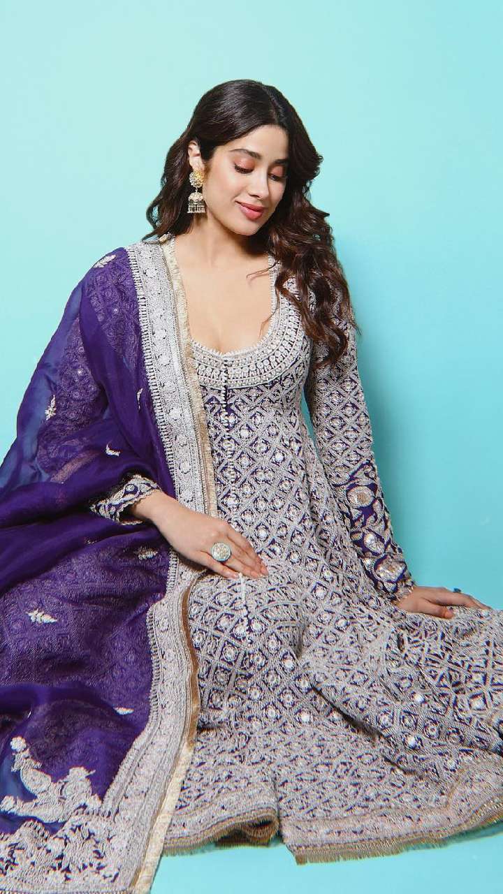 आप इस तरह के एम्ब्रॉयडरी सूट से भी अपने लुक को शानदार बना सकती हैं। जाह्नवी कपूर का ये लुक भी शानदार है।