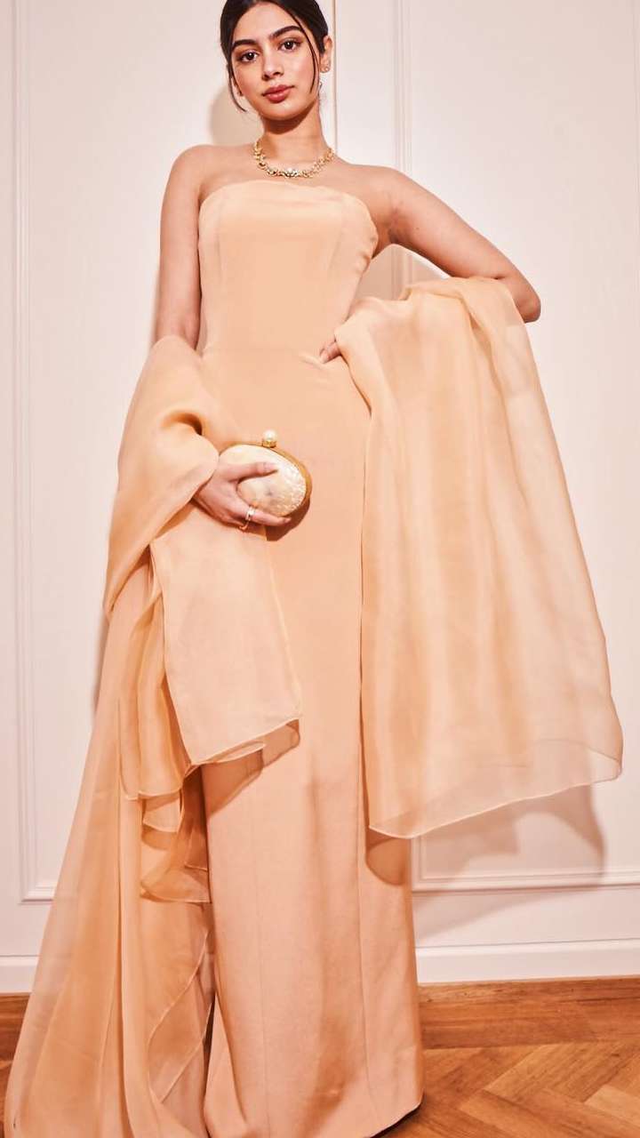 पार्टी में इस ड्रेस को कैरी किया जा सकता है। इस लुक में खुशी कपूर बेहद ग्लैमरस लग रही हैं। एक्ट्रेस का नेकलेस उनके आउटफिट में चार चांद लगा रहा है।