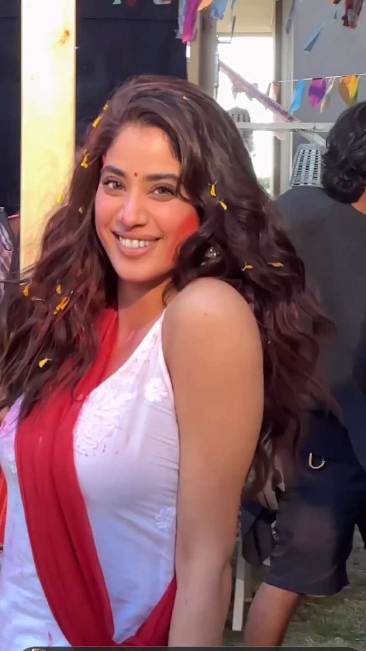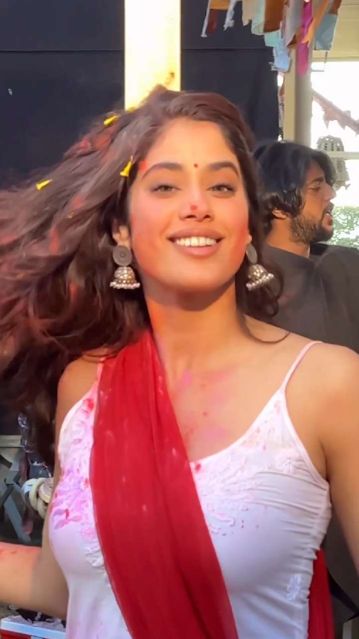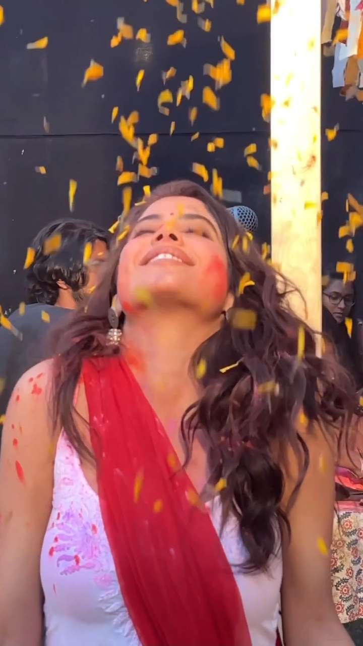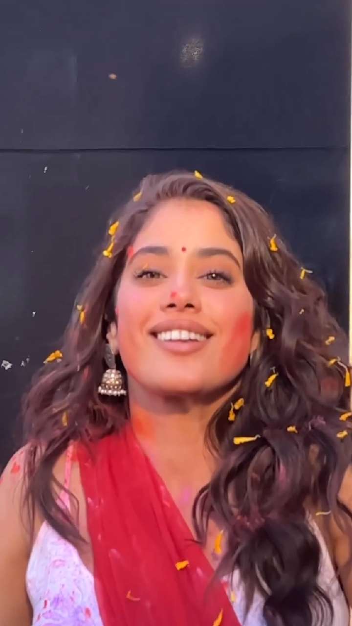 जाह्नवी तस्वीर में फुल उड़ाते जनवरी महीने में ही होली सेलिब्रेट करती नजर आ रही है।